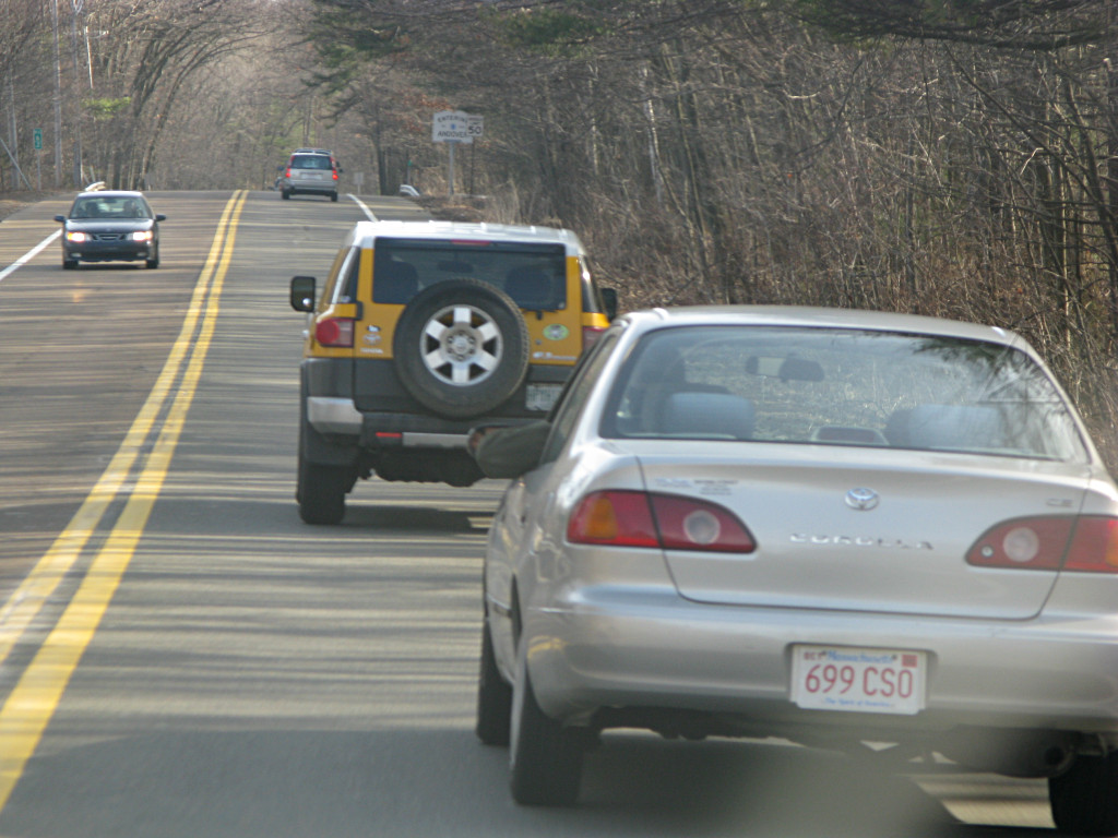 While I cannot determine what state the FJ's plate is from, the green license plate lettering should help narrow it down and the owner should be easily findable through a partial-plate search and vehicle match across nearby states. Also note that the vehicle was likely purchased at Ira Toyota, shown by the small black and white oval logo to the left of the spare tire. Commentary I am all in favor of safe, orderly driving. As a hybrid owner interested in receiving good fuel economy I have a keen sense of smooth, predictable vehicle control and the value of momentum. Abrupt speed and direction changes on the part of other drivers are an immediate red flag to me that indicates unsafe and/or aggressive behavior. Personally I'm a step 9 driver with a spotless record, and have not only taken the InControl advanced driving course offered recently in Massachusetts but also helped many other people improve their own driving methodologies to increase safety and minimize fuel use. I host a website, viewable here, which hosts many articles and documents on hybrids as well as "ecodriving" hints for any type of vehicle. Thus, when I see the kind of behavior and attitude that the FJ driver telegraphed to me as early as when it arrived in the left-turn lane by Bertucci's, my immediate thought is that such drivers need to be OFF the road entirely until remedial training is administered and proven effective. There is no place for aggressive driving on the public ways, period, and a very limited context for "performance" driving in the case of emergency vehicles on a call. And yet we see aggression and inattention on the roads around us all the time these days; that most certainly does not make it right. I cannot even begin to guess whether the FJ driver was intoxicated, but it is certainly within the realm of possibility. I consider the fact that the little car-chase down 125 remained within legal speed limits as somewhat significant, as if the FJ was truly trying to "escape" it likely would have been going much faster, but then its speed in the residential neighborhood became a much greater threat. I would love to eventually find out what the FJ driver was thinking that whole time and led to all of these largely inexplicable actions, but more importantly I would like any effort possible to be made in REMOVING said driver from the roads until the root cause of these actions is permanently fixed.  |