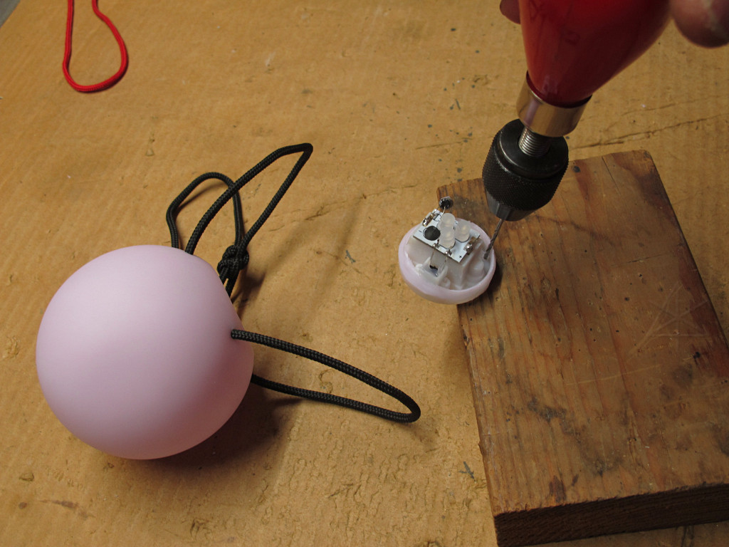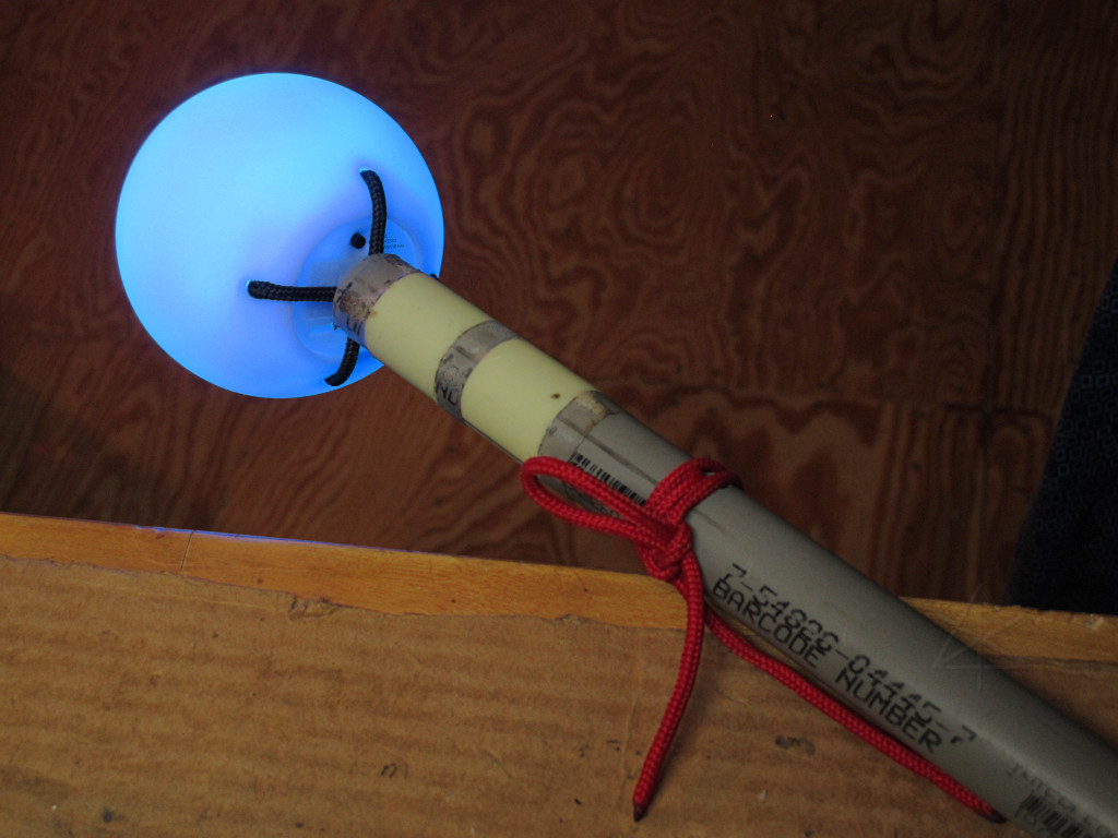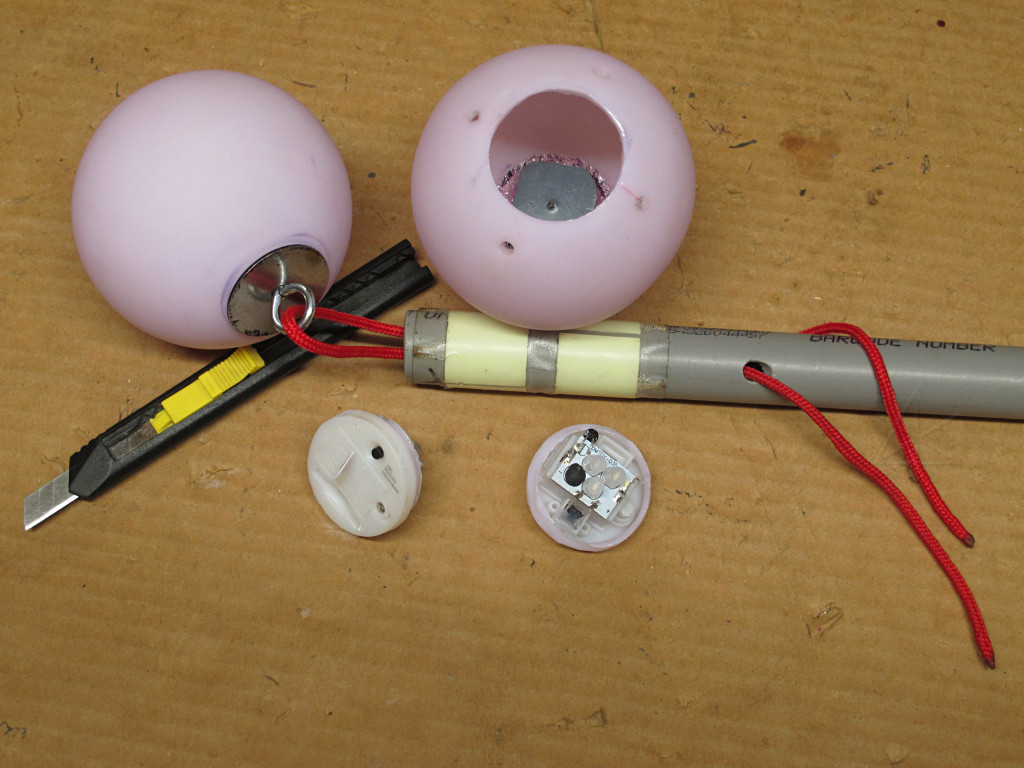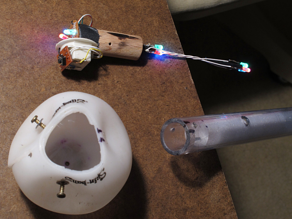 I was away from my home workshop at the time but had brought some parts and materials with me, and managed to make do with the rudimentary tools on-site where I was staying to put an early revision together. It totally looked like a homebuilt bomb. Two clusters of RGB LEDs to point down into the tube, now lined with some white foam and sort of an interesting glittery sheet of diffusion material, and one more cluster would light the ball on the end. Everything was fastened to a bit of 3/4" dowel, which fit perfectly inside the 1" OD polycarb tube and the ball and everything else simply got screwed together from three directions. A bit fiddly to fit up, but fairly solid once snugged together. The little black button-switch could be activated by simply pushing in on the squishy ball at the right spot over it [later sharpie-marked at each end of the staff]. |