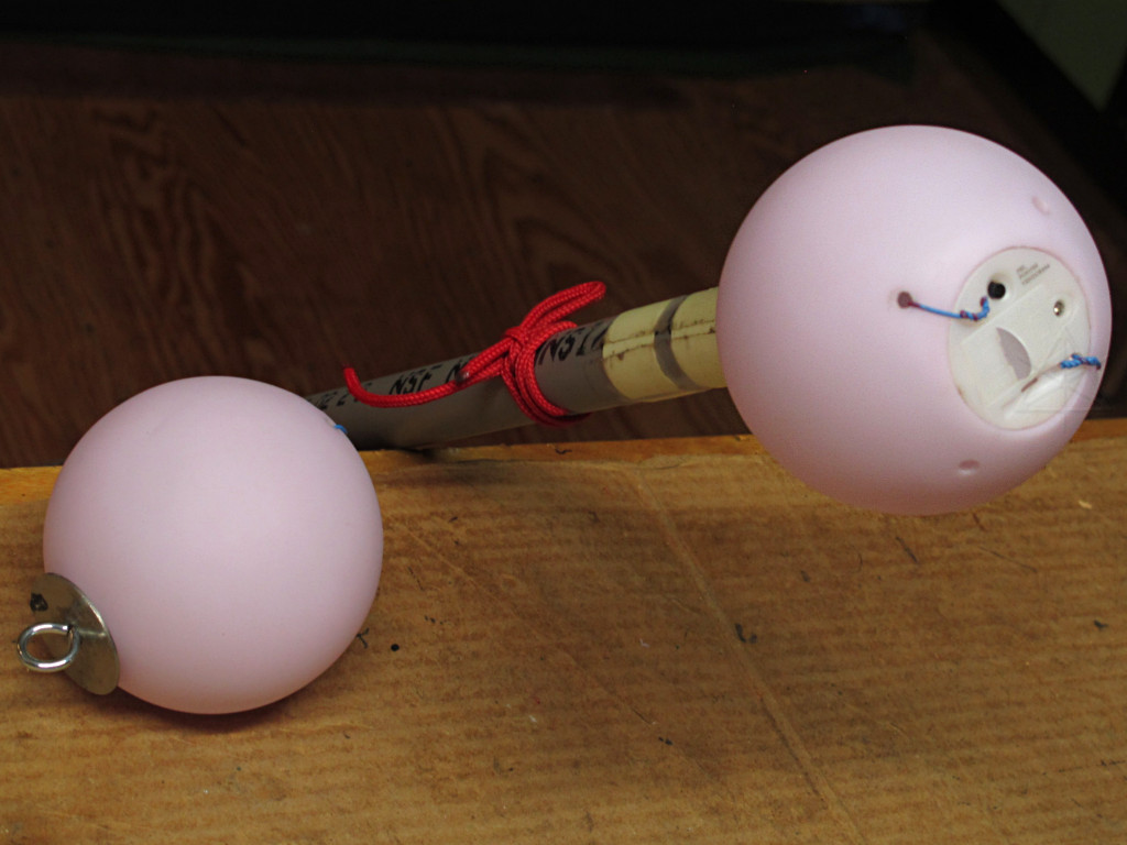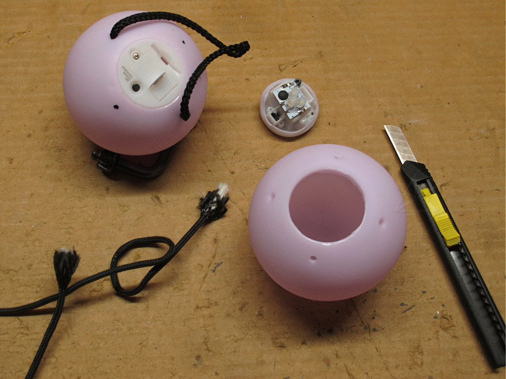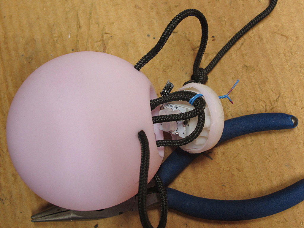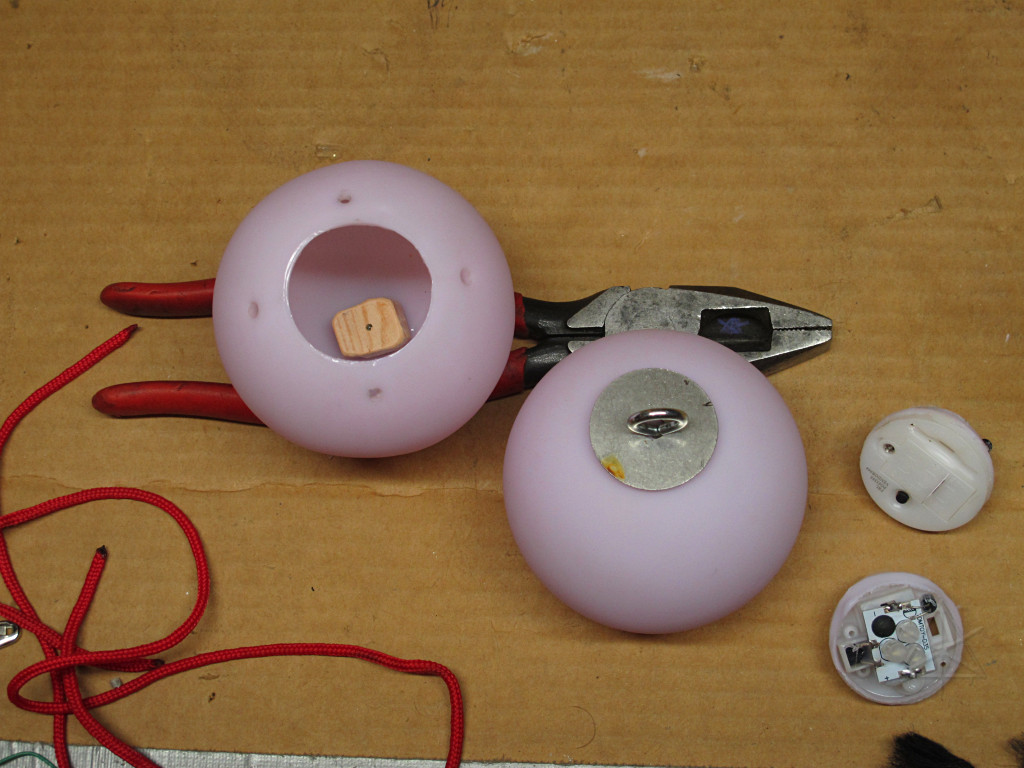 I was away from my home workshop at the time but had brought some parts and materials with me, and managed to make do with the rudimentary tools on-site where I was staying to put an early revision together. It totally looked like a homebuilt bomb. Two clusters of RGB LEDs to point down into the tube, now lined with some white foam and sort of an interesting glittery sheet of diffusion material, and one more cluster would light the ball on the end. Everything was fastened to a bit of 3/4" dowel, which fit perfectly inside the 1" OD polycarb tube and the ball and everything else simply got screwed together from three directions. A bit fiddly to fit up, but fairly solid once snugged together. The little black button-switch could be activated by simply pushing in on the squishy ball at the right spot over it [later sharpie-marked at each end of the staff]. |