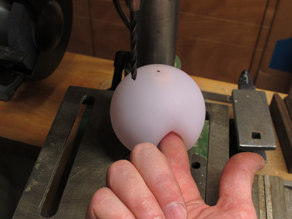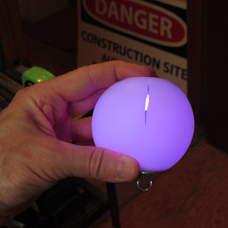 A couple of days later the second set of balls showed up, this time from SpinballS. These turned out to be an almost identical design, possibly with slightly better build quality and a different-ish set of blink/fade patterns. Having found a workable mounting method, I figured it would do okay for this set as well and I had plenty more PVC slab and ringbolts left. But I wanted to try and avoid coring the entire electronics module out of the bottom, preferring to leave it glued in if possible. |