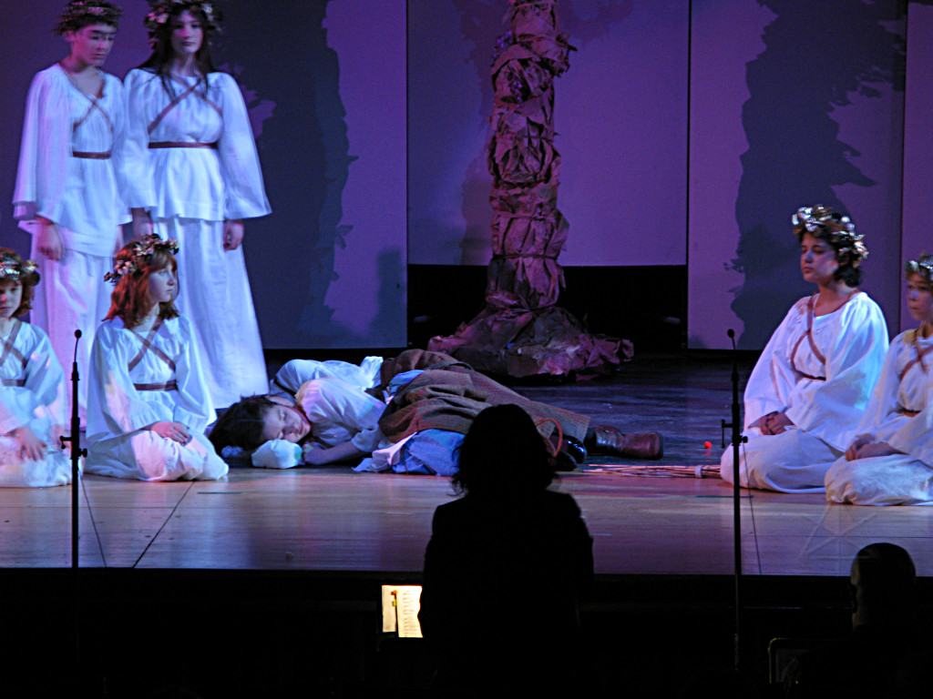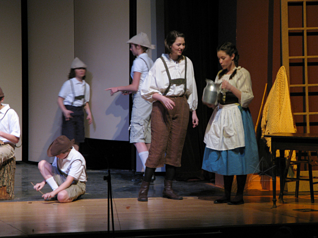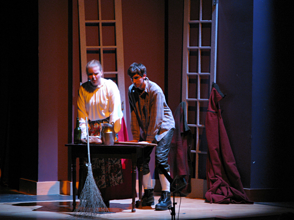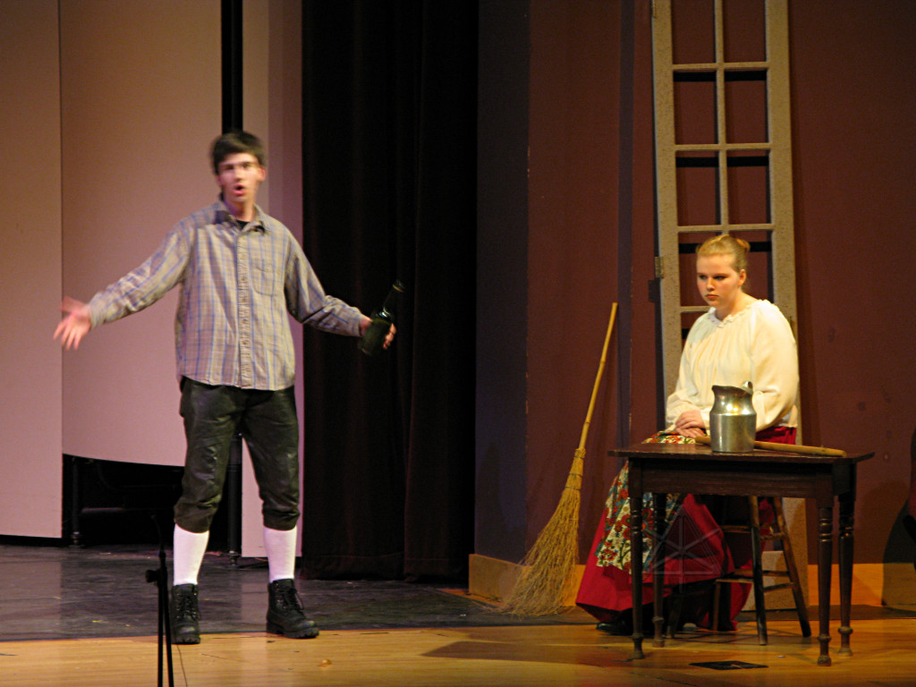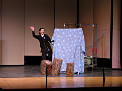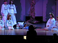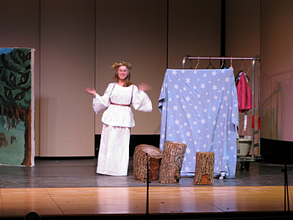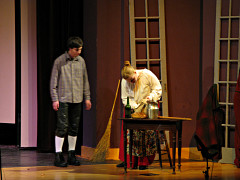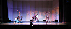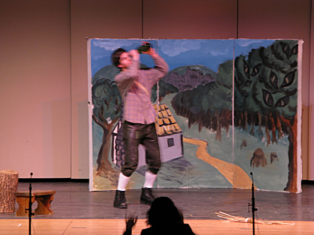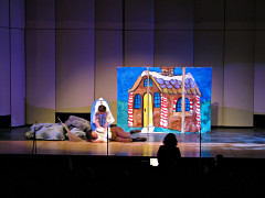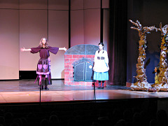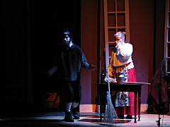 I was asked to help the lighting staff set up for this show, and then with little else to do during the run I attempted to capture a bunch of stills of it from fairly far back in the hall. Considering that I was using a point-n-shoot and generally needing fairly long exposure times to get anything at all, some of them came out okay. I tried to anticipate and time the moments when actors would stop moving, with dubious success. Freely acknowledging the possibility that this might still be way too many pictures, here are the best of the batch. (Photography enthusiasts may want to read the commentary scattered throughout this, particularly at the end, for more information.) Each small picture is linked to a full-size version. And here is a convenient linear list of the large ones, suitable for input to a bulk-download handler. (About 25 Mb worth all told)  |