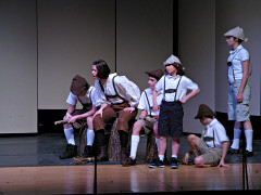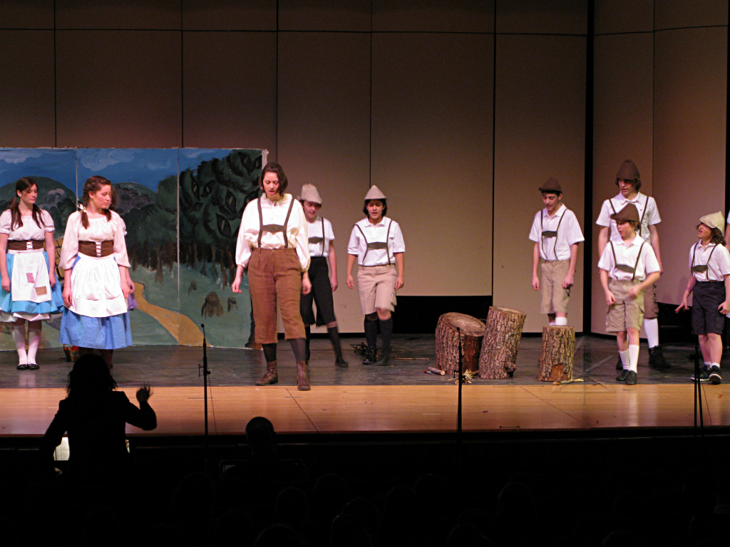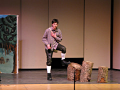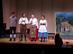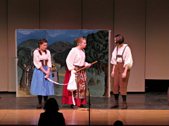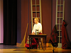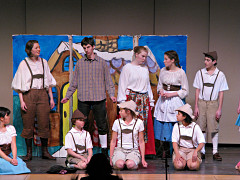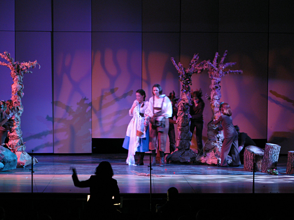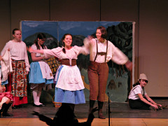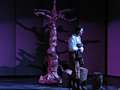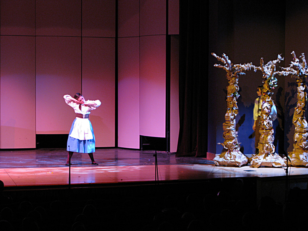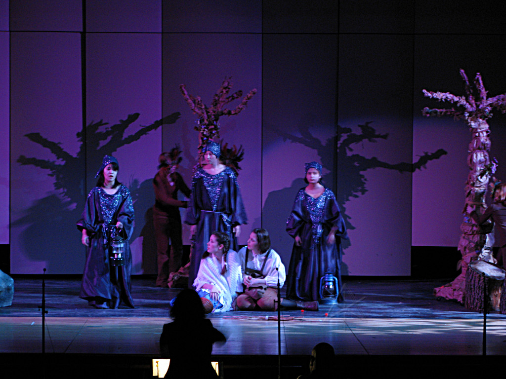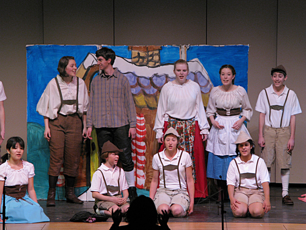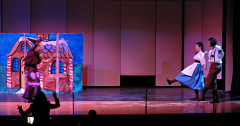 I was asked to help the lighting staff set up for this show, and then with little else to do during the run I attempted to capture a bunch of stills of it from fairly far back in the hall. Considering that I was using a point-n-shoot and generally needing fairly long exposure times to get anything at all, some of them came out okay. I tried to anticipate and time the moments when actors would stop moving, with dubious success. Freely acknowledging the possibility that this might still be way too many pictures, here are the best of the batch. (Photography enthusiasts may want to read the commentary scattered throughout this, particularly at the end, for more information.) Each small picture is linked to a full-size version. And here is a convenient linear list of the large ones, suitable for input to a bulk-download handler. (About 25 Mb worth all told)  |