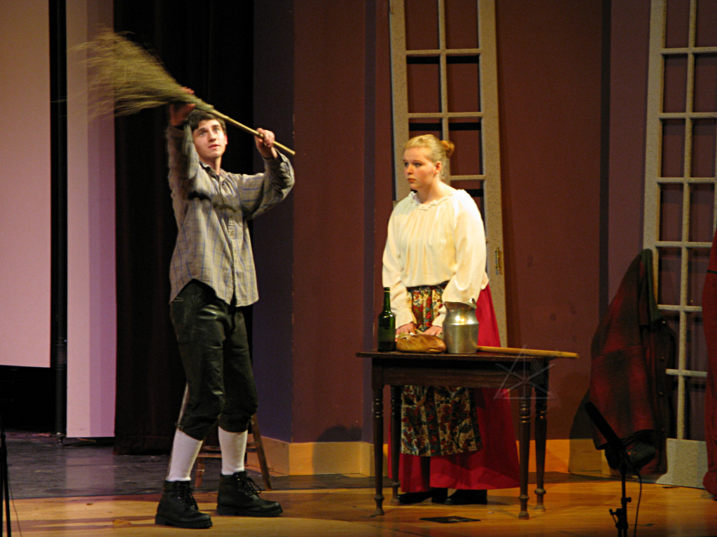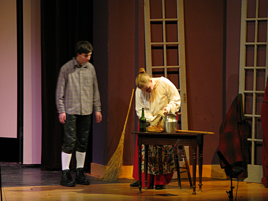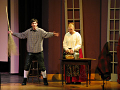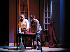 I was asked to help the lighting staff set up for this show, and then with little else to do during the run I attempted to capture a bunch of stills of it from fairly far back in the hall. Considering that I was using a point-n-shoot and generally needing fairly long exposure times to get anything at all, some of them came out okay. I tried to anticipate and time the moments when actors would stop moving, with dubious success. Freely acknowledging the possibility that this might still be way too many pictures, here are the best of the batch. (Photography enthusiasts may want to read the commentary scattered throughout this, particularly at the end, for more information.) Each small picture is linked to a full-size version. And here is a convenient linear list of the large ones, suitable for input to a bulk-download handler. (About 25 Mb worth all told) |