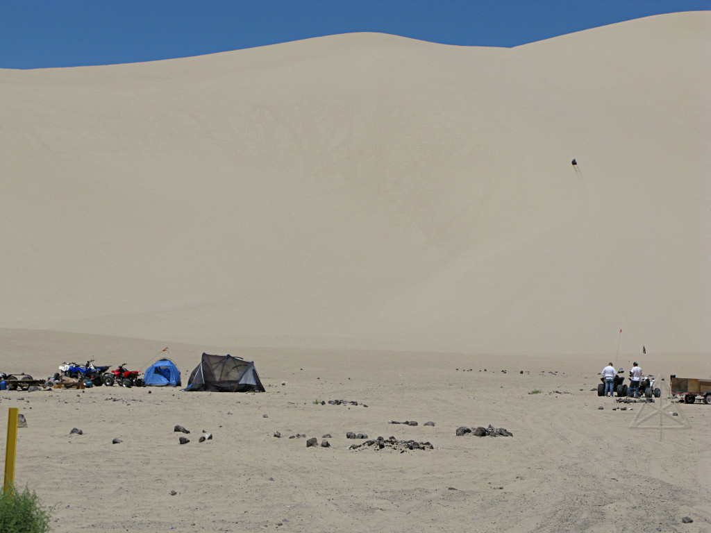 If you want to get every part of your car bouncing vigorously up and down, try going down a sand road as washboardy as the access road into here was at the time. OMFG. I thought my instrumentation, both built-in and add-on, was going to fly apart into tiny electronic chaff. The mere process of slogging into there and back out knocked a full 2 MPG off my average, 100 miles into the tank. But I pushed on, past the RV that's just starting outward here and through its dust cloud, and finally got closer to the base of the mound. | |