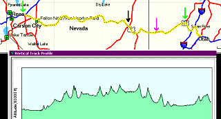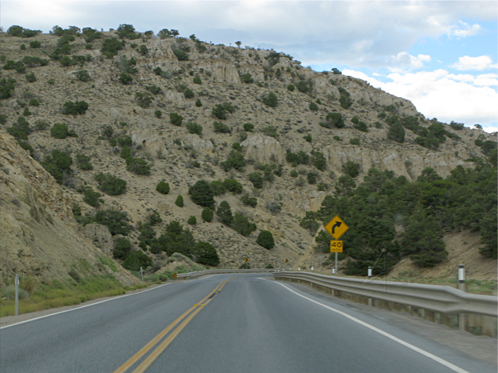 In general, a constant-power scenario of letting speed drop a bit on the uphills and getting it back on the downs tends to be more efficient than trying to push hard up the hills and then have to brake more on the backside. Some vehicles have no choice about this, where a lower horsepower-per-ton ratio is accomodated with climbing lanes and "flashers under 40 MPH" signs and the like. On just starting one of these rises somewhere between Eureka and Ely, I noticed a semi quite a ways back from me just before going around the first bend and losing sight of it. I figured it would eventually overtake and pass but probably way after negotiating this ridge. |