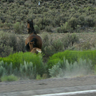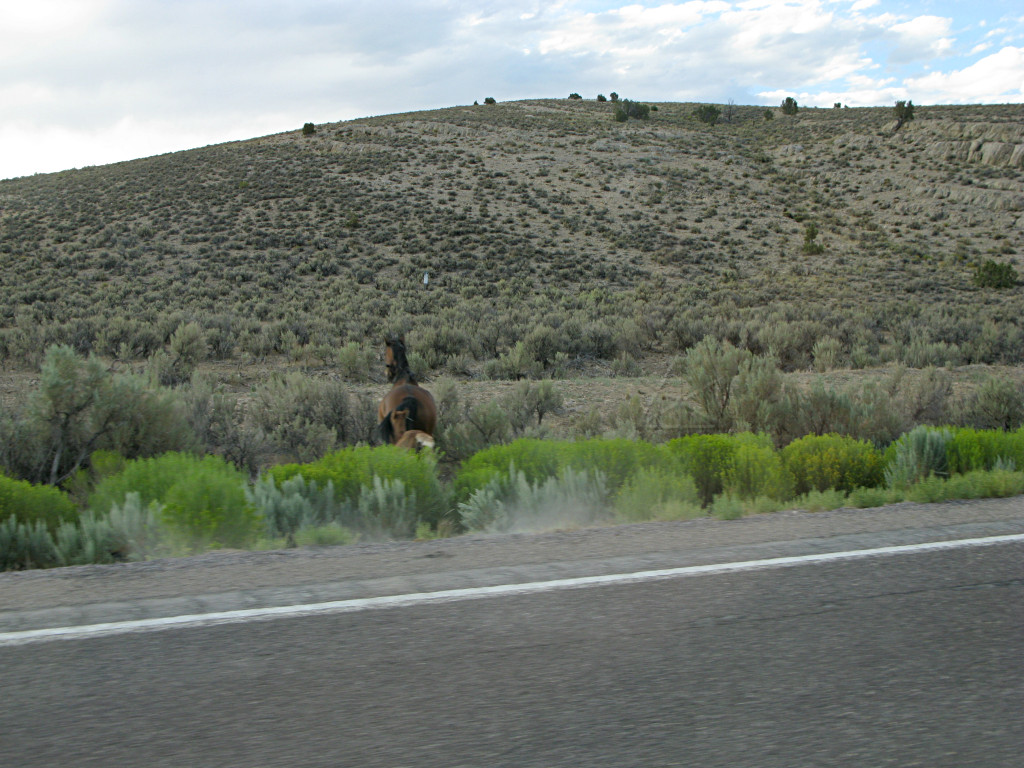 Three or four turns into the ascent and nearing the summit, I noticed that the truck behind me had already closed the gap quite a bit and its nose was just peeking around the bend behind me as I reached the end of a straight part. I crested the hill and began a nice controlled glide down, still being mindful of the recommended speeds around curves and frankly, they aren't kidding when they rate those -- you go much over the 40 or 45 that the sign says, you're pushing the cornering traction pretty hard. Then, all hell broke loose. While all of the following happened in quite rapid succession, I can recall almost every detail because it was all so strange and scary at the same time. I rounded another bend and was babying the regen while headed for the next one down, and then saw a small pack of wild horses pop up out of the dip ahead to my right and start diving across the road. Wild horses. Out of nowhere, on the run. The only other livestock I had seen all day was cows, standing perfectly still in flat fields. I still had plenty of distance between me and them, but probably went well over the regen current limit as I braked fairly hard to make sure they'd have room to get across. At the same time, mindful of the truck still gaining behind me, I lit the hazards to warn its driver that something was up and I would be going much slower for a stretch. Then I started scrambling for the camera, because this had to be the most surprising thing I'd seen all day. Most of the group got across the road well ahead of me but as I dropped to about 20 MPH and began to come level with them, there was one mare and her foal remaining to the right side of the road who seemed to hesitate a bit. But rather than stop and wait for me to ease past before crossing, the two of them started RACING me along the shoulder, apparently really wanting to cross and rejoin the herd right now. The mare was wall-eyed, clearly looking at me and her offspring at the same time and launching into a serious gallop. I continued slowing until they had enough room to dash across in front of me, and around this time the camera had finished booting up and I began to swing it over toward the herd that was now all on my left. All of that ensued in the space of about five seconds, and I hadn't unglued my eyeballs from the horses and the road the entire time. Then I checked the rearview, and all I could see was the "big teeth" of the truck's grille completely filling the hatch window. |