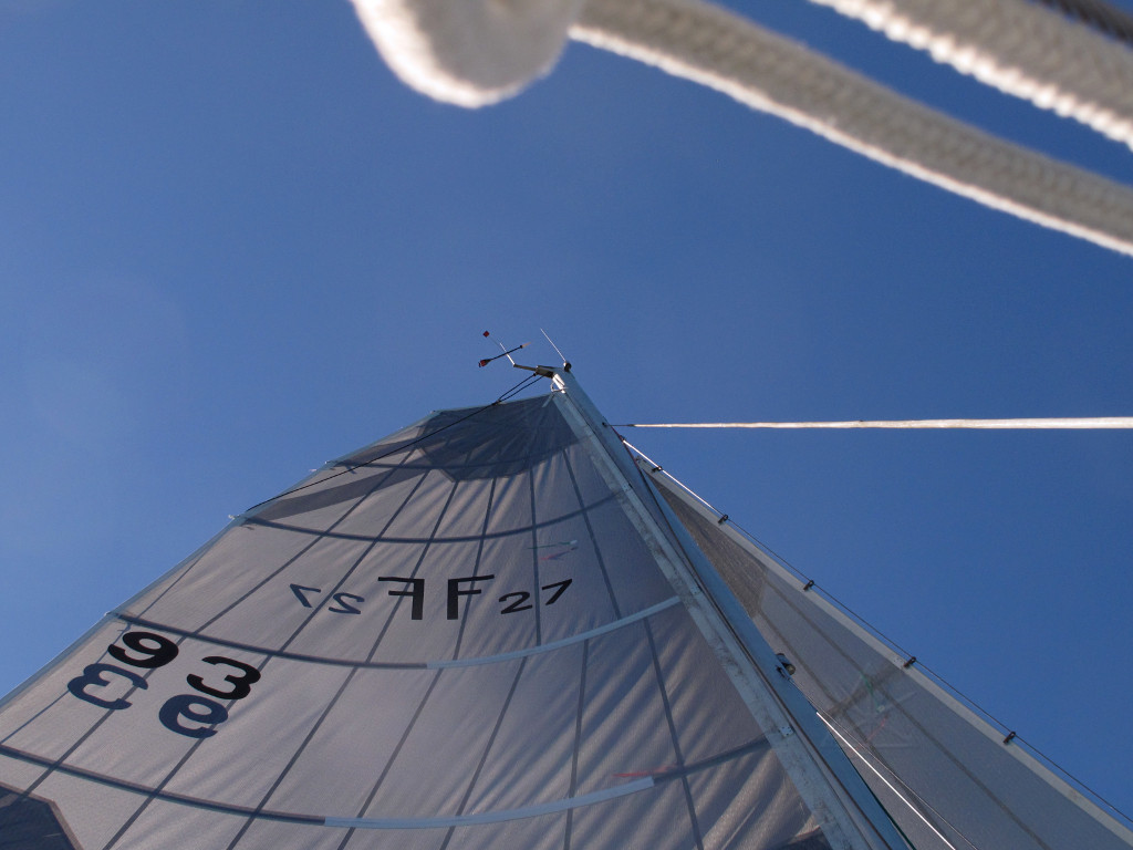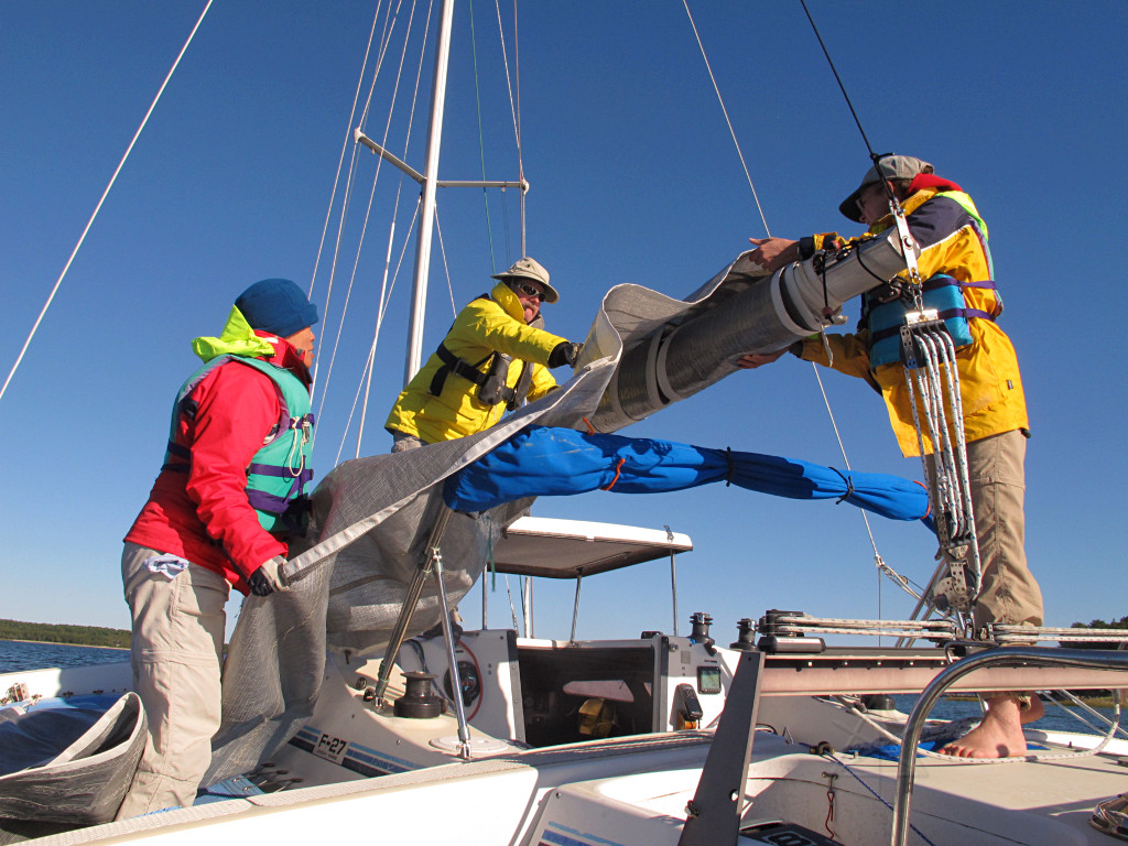 Buttoning up after arrival at Mark's Inlet.  Rolling the mainsail onto the boom ... |
