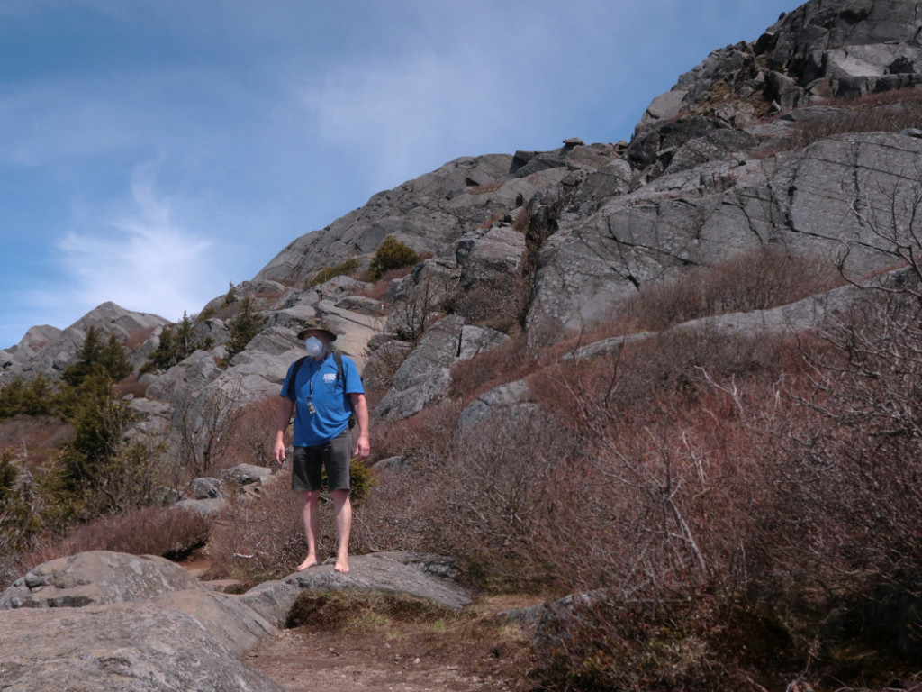 | Yearly mission accomplished, and a nice little adventure had in the process -- 6.5 miles in all according to the GPS. The trip wasn't anything like the nightmare that various doubters had anticipated, and sure beat the heck out of sitting inside the house glued to the news. Still, it was clear that "shelter in place" had not been good for my hiking chops, despite a few short local jaunts in the interim. I felt more drained after today than any prior Monadnock run, but maybe that also had to do with keeping my own blasting-along pace instead of being with a group. Frankly, what probably burned my quads the most was all that careful slow-stepping down on the downhill bushwhacks. Somehow my knees came through it without complaint, which I attribute to the IT-band and other stretches done before really getting into it. |
