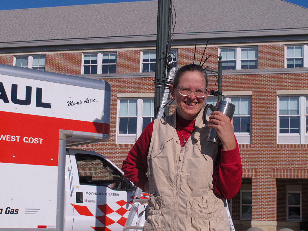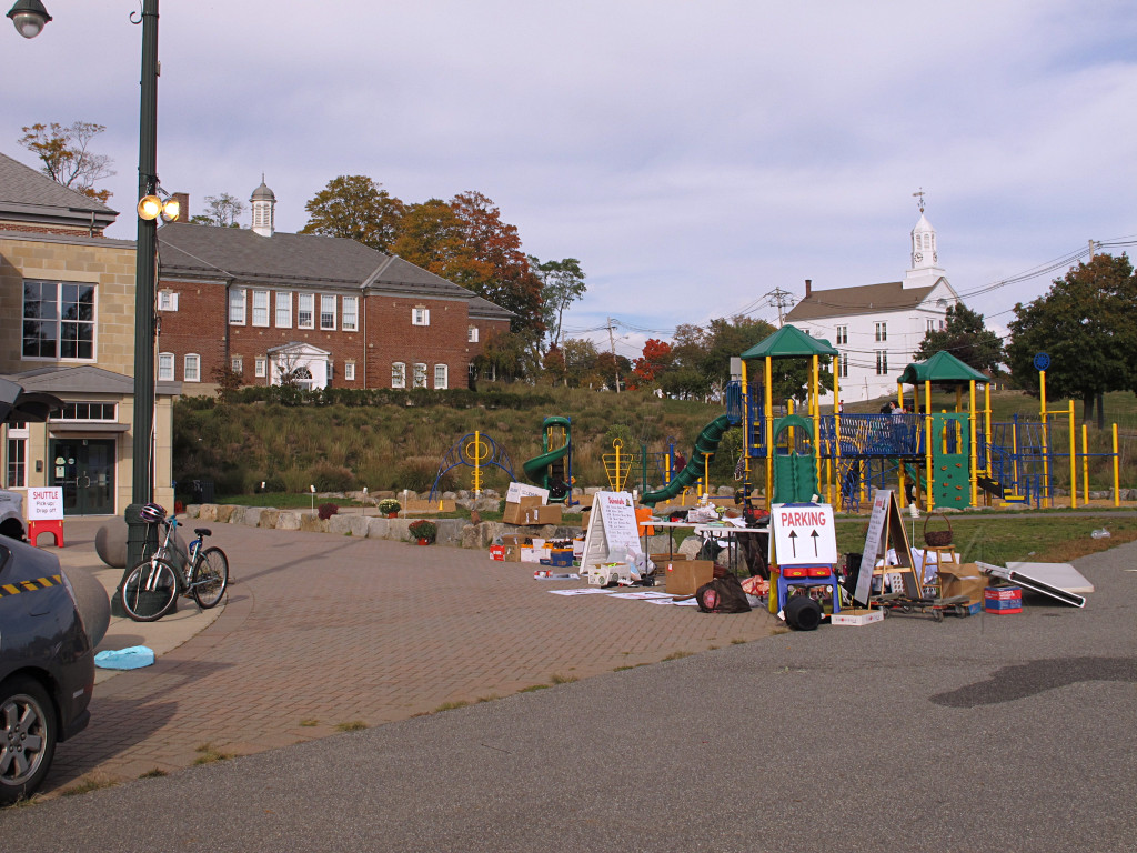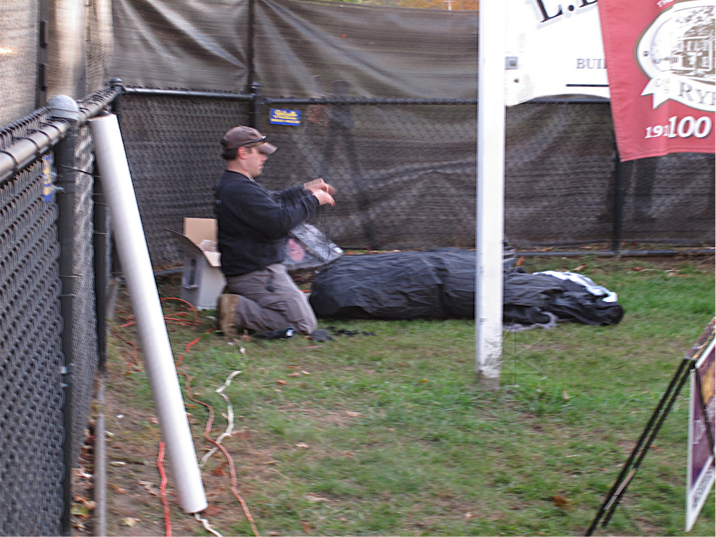 The ideal point to light the playground from would have been from the roof of the school building at that corner, with lights clipped to a cinderblock or something like I'd done on the park-building. But the building super nixed that idea, citing "safety reasons". Seriously?? I've probably been on more roofs in my lifetime than he has... Instead, I placed myself at *greater* risk by getting way up on a ladder to bind a group of lights as high as I could to one of the streetlight poles around the driveway. It actually worked out okay either way; three of my big CFLs were able to add just enough visibility light over a broad area that it helped, even at the non-optimally long distance. A little bit of preliminary setup happened Friday night, but the group couldn't get access to the field before 5pm anyway so we were there setting up a few pop-ups in the dark and cold. Build began in earnest early Saturday morning.  |