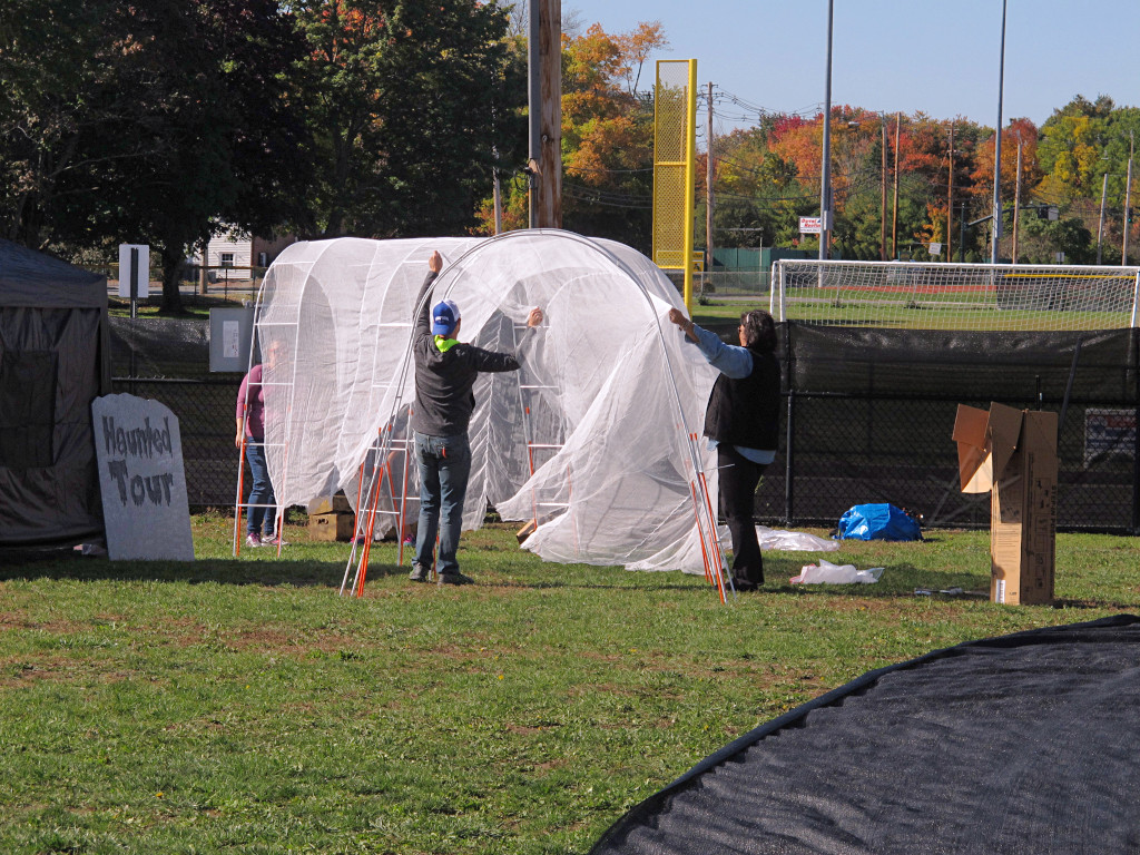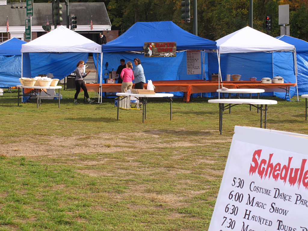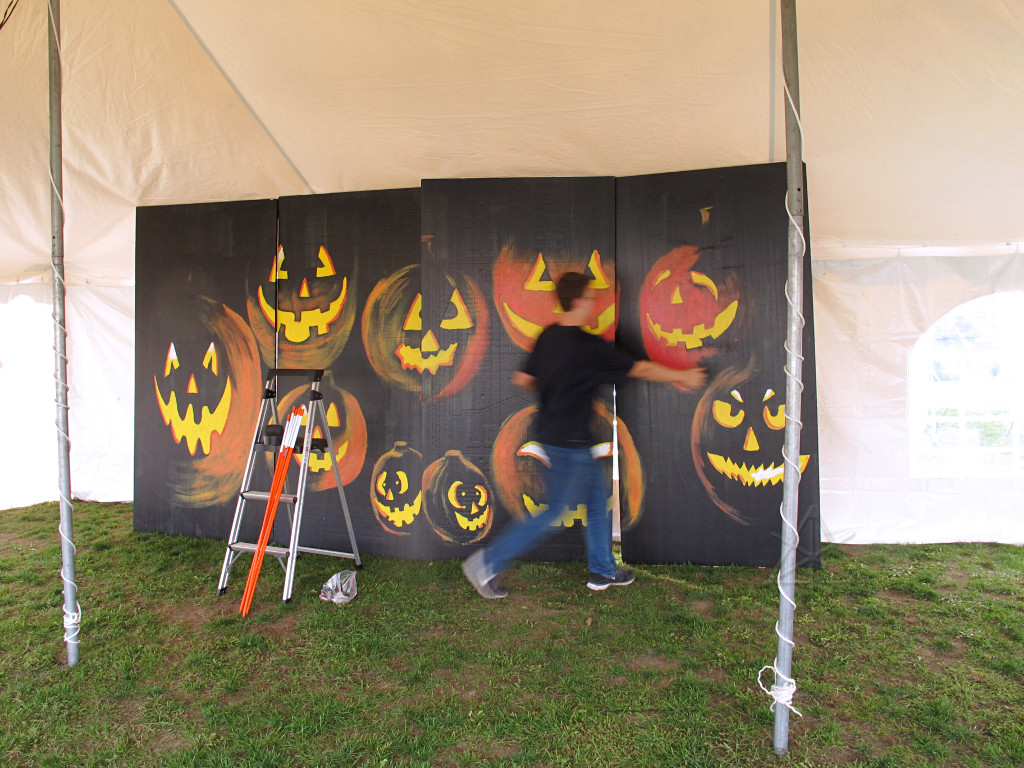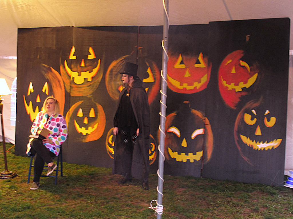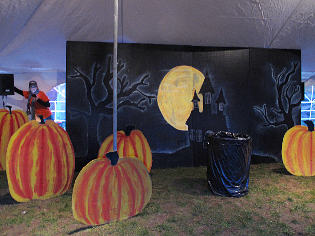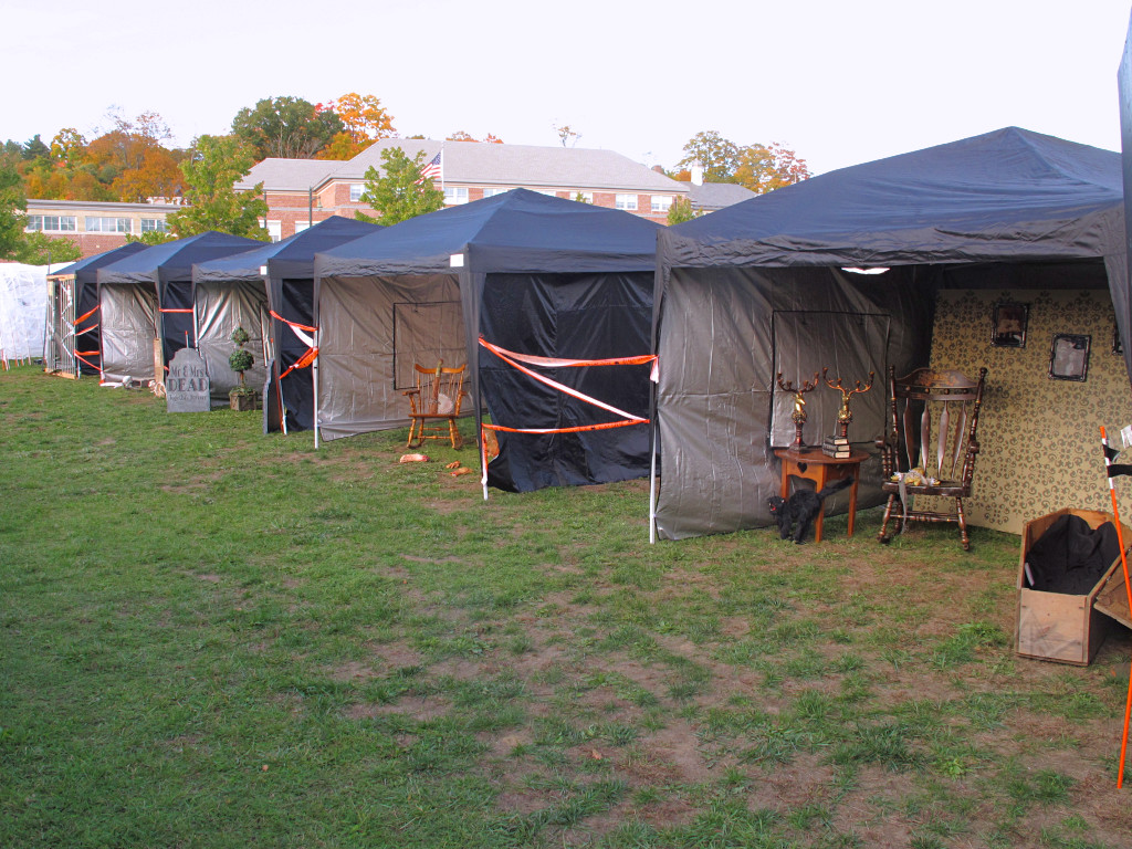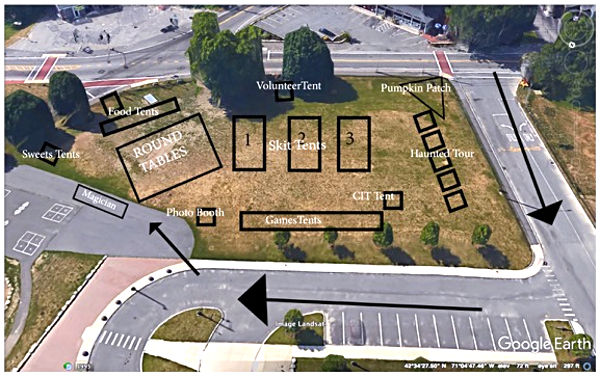 numbered tour batches with guides, skit tents, games, a pumpkin patch,