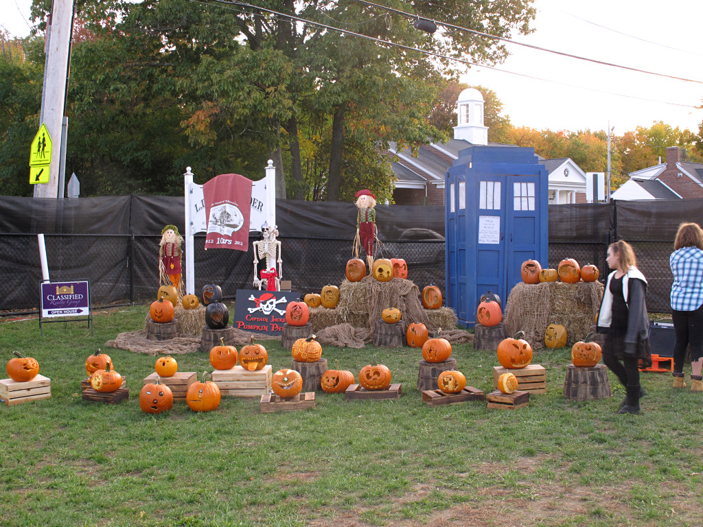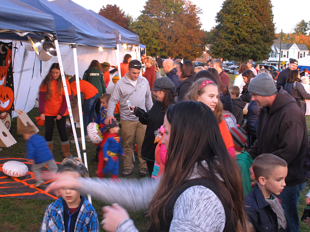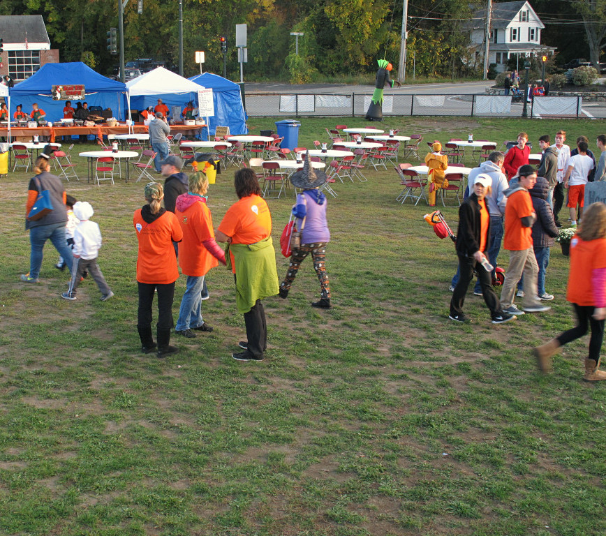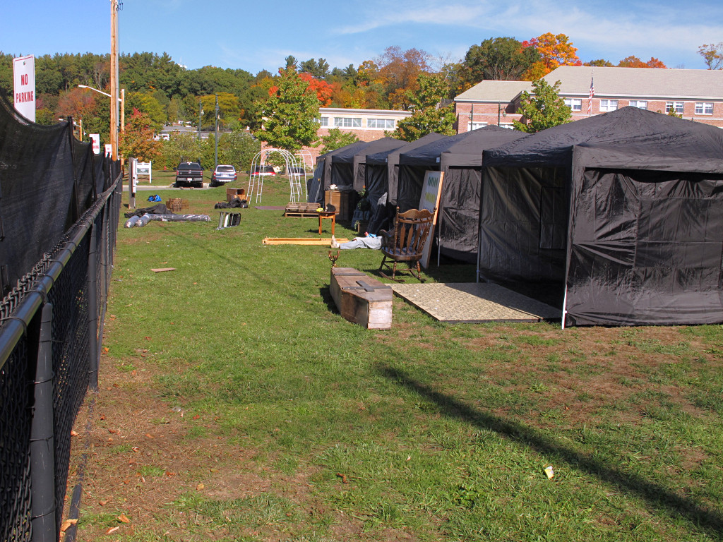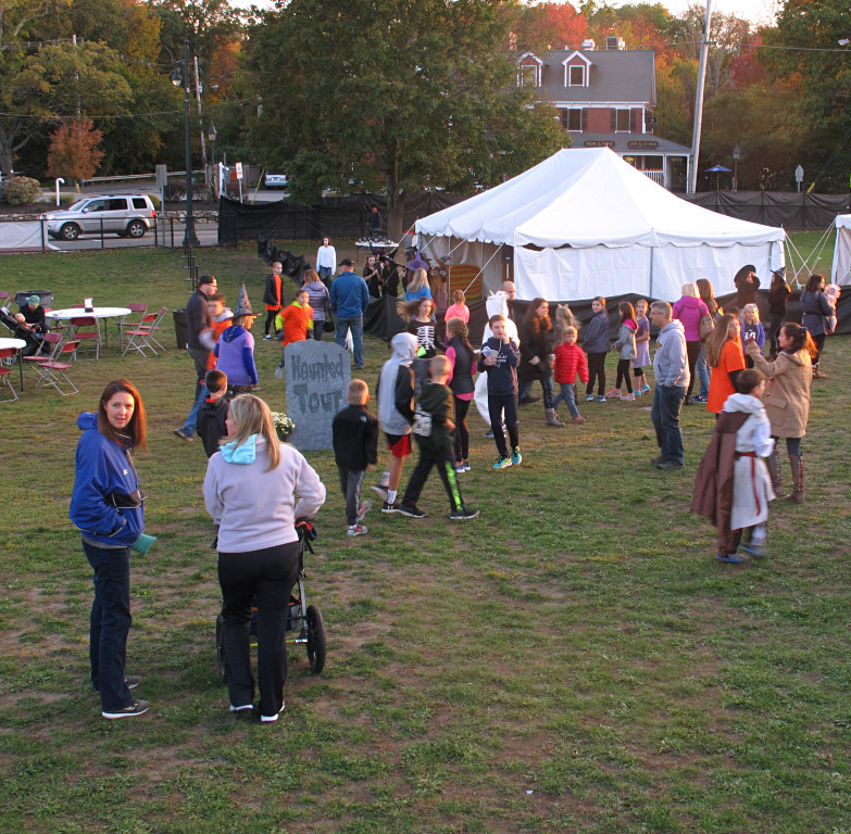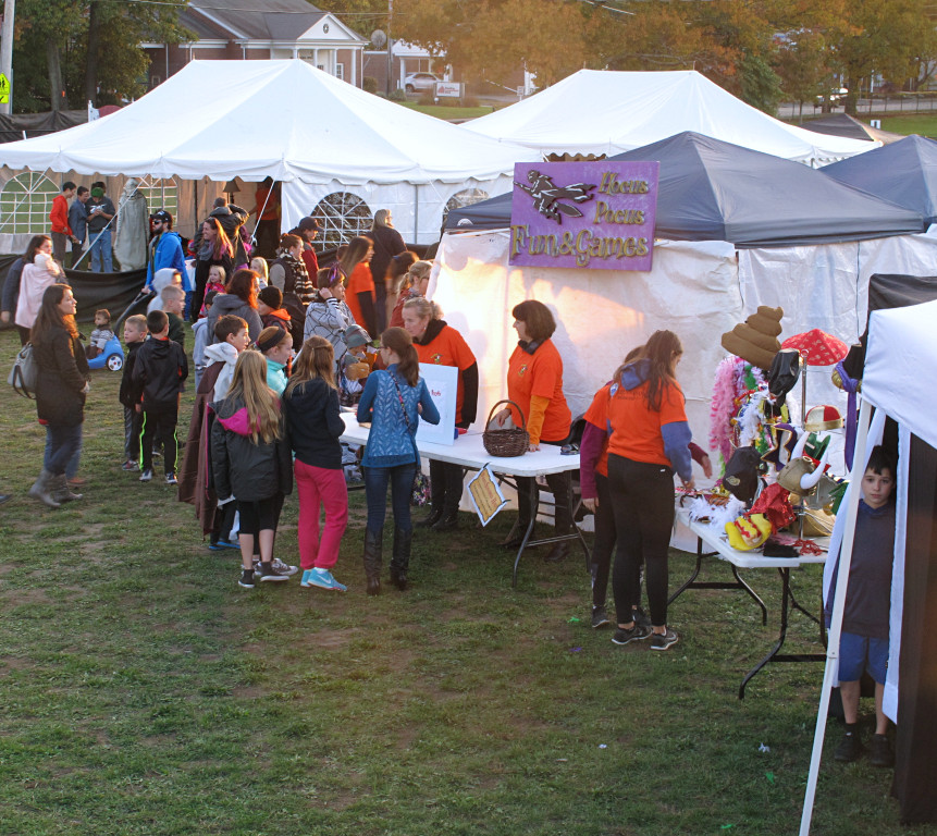 numbered tour batches with guides, skit tents, games, a pumpkin patch,