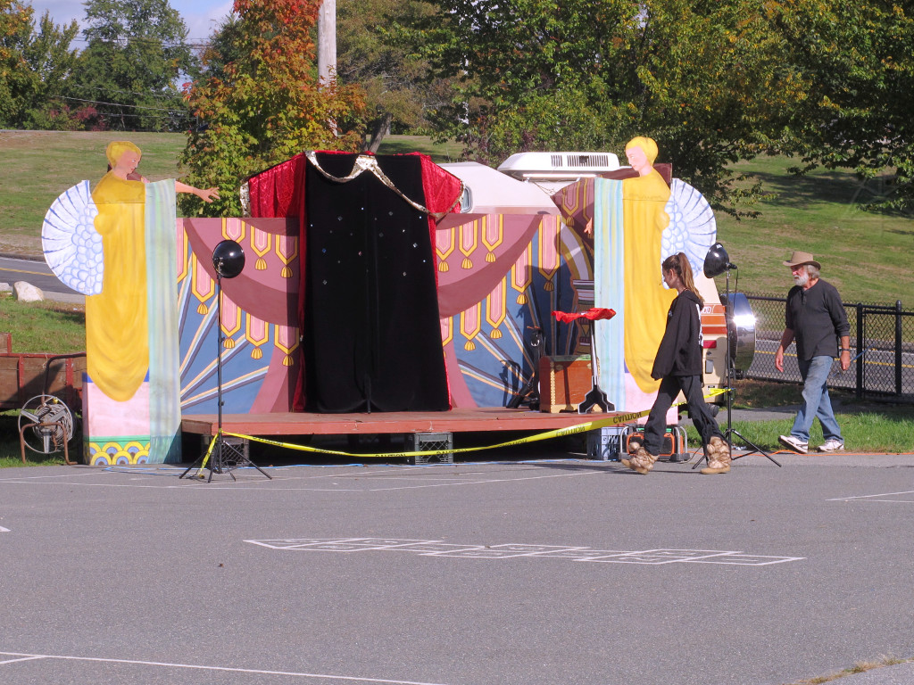 Jim the magician came again, and his stage has clearly undergone a bit of spiff-up with new artwork. He's also changed over to much more energy-efficient lights. His daughter came along to help with the show, and spun fire poi as part of it. We had a fun convo about spinning and barefooting and various other things. |