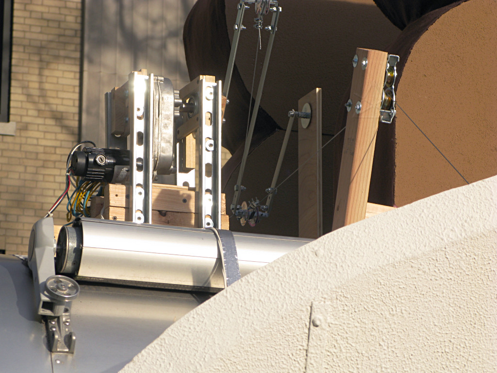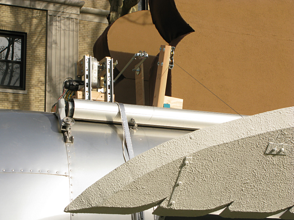 The wing flapping was driven by a clever dual-crank mechanism and a variable-speed gearmotor. Cables raised the wings; gravity lowered them. |