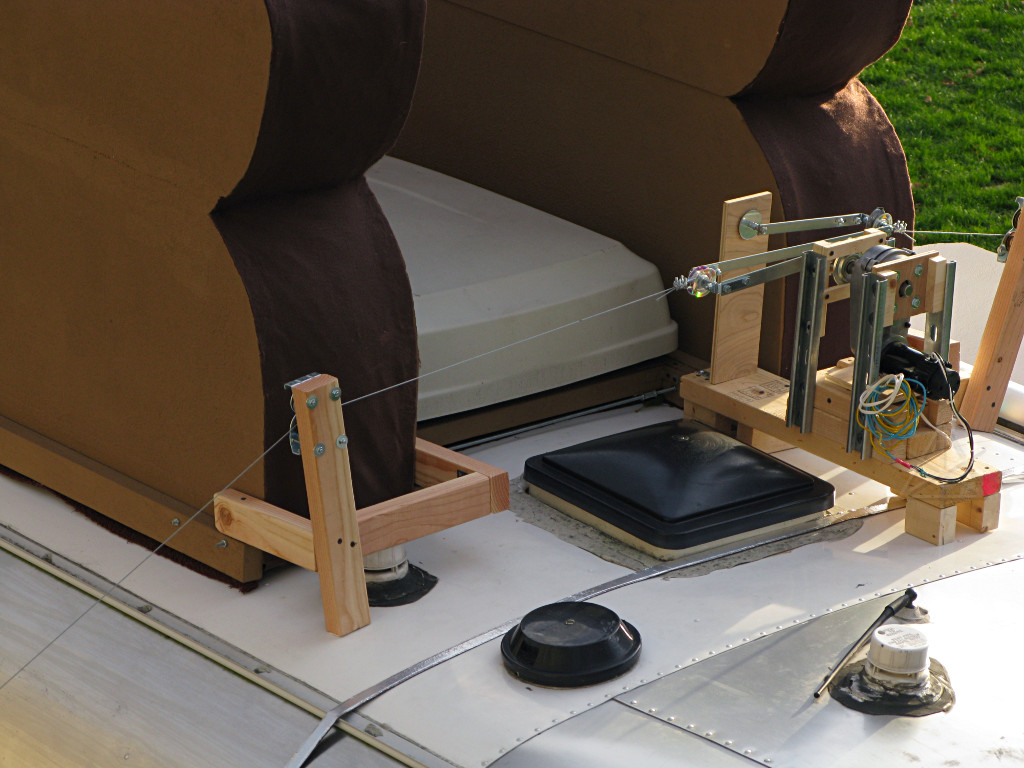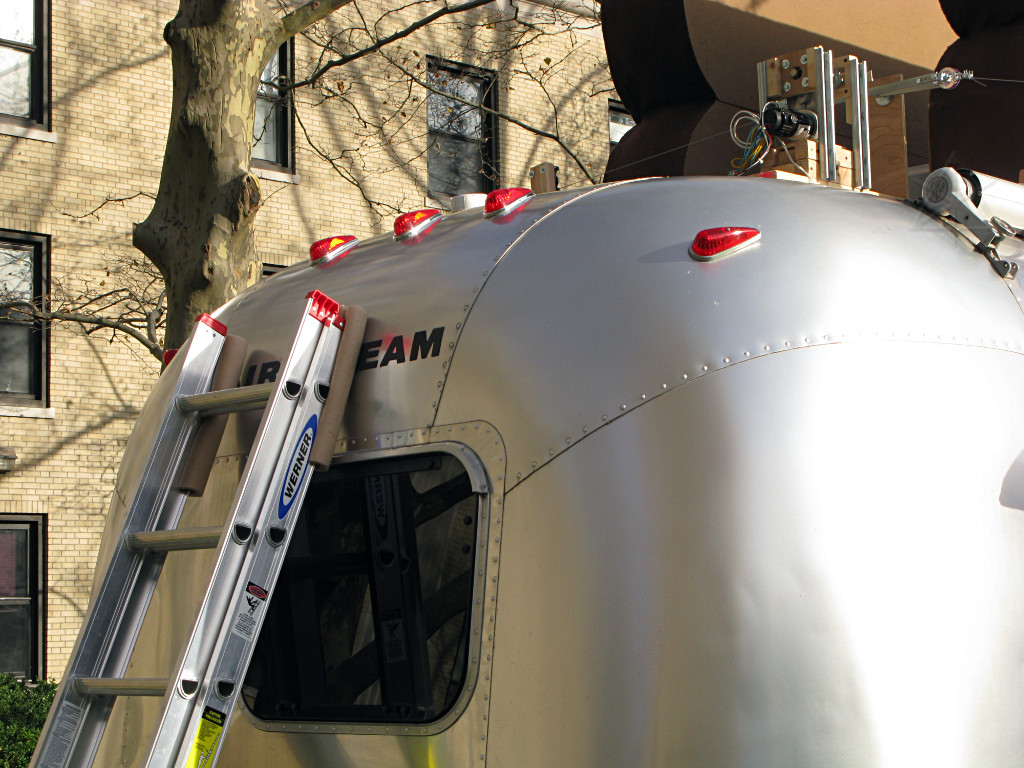 A ladder was specially padded up to lean gently against the Airstream's aluminum skin and provide roof access to unsnarl the works. |
