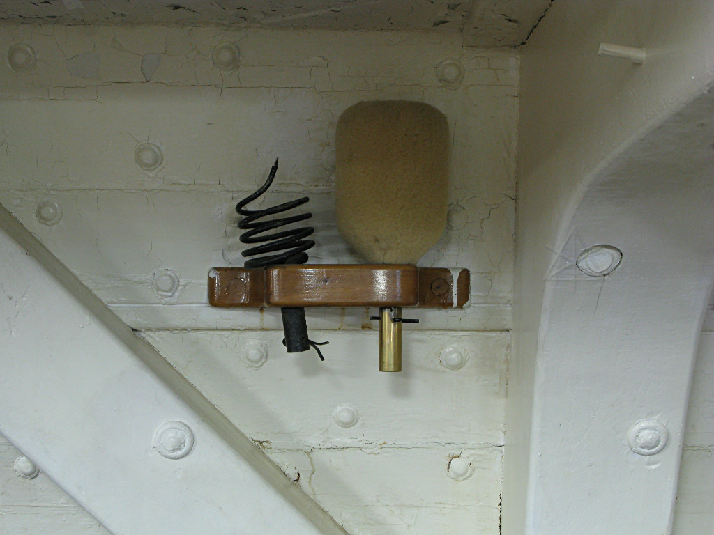 The odd round bluish thing is daylight coming in through a primitive attempt at an operable porthole, which there are several of pierced through the hull here and there and referred to as "airports". These weren't in the ship's original design but were added a little later in an attempt to bring in air and maybe a little light, especially on the berth deck, but they often leak even when secured shut with a large bolt. |