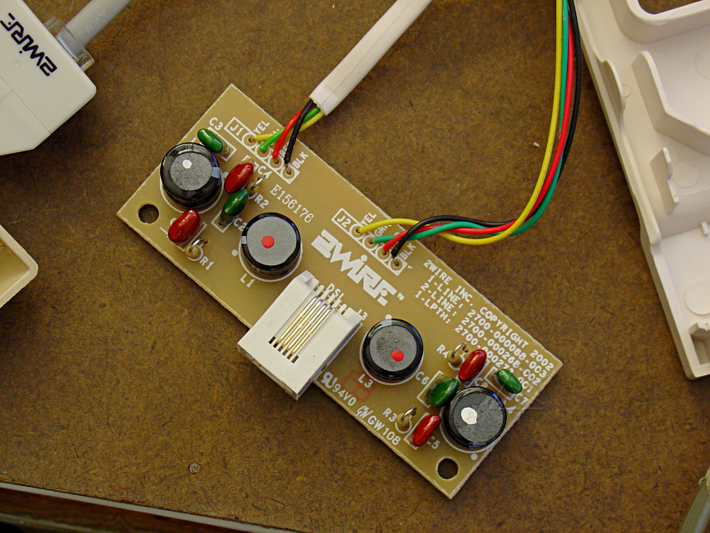 Finally the signal goes to pseudorandom modulation, and we're up and running. Here is a short .WAV file of the last sections of negotiation, captured by holding the butt-set monitor up to the camera mic while recording a picture- with-memo. Primitive, but it gives the idea. The post-filter side is very quiet by comparison, so obviously it's doing its job. Connecting a phone across the unfiltered side produces some pretty serious hash, and here we can easily see why the filters must get installed in-line with every other set in the house. So now I understand how the copper pair is dual-purposed for DSL and POTS at the same time, and they've made it all pretty easy with these filters even if running around filtering all the OTHER outlets is sort of klunky. I'd rather do it on a house-wide basis with one filter and a separate line to the DSL box, but the wiring here was absolutely not conducive to doing that. The filters aren't 100% perfect -- I can hear a little bit of hash on a quiet line post-filter, but not enough to be annoying. These days, people are so used to much lower quality than this on their cellphones that they probably wouldn't think twice about a little bit of hiss. When I went to install the wall-phone adapter I found that the screw keyholes didn't match the wall box spacing, so I had to drill extra holes and kludge it together with washers and longer screws. Duh. So I would have had to take the thing apart regardless.