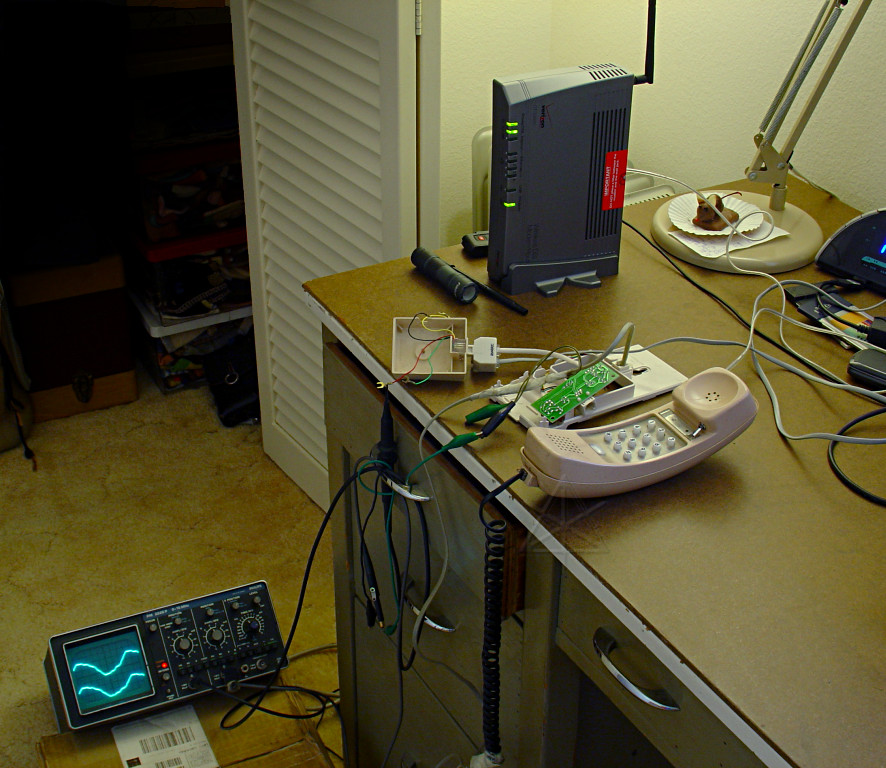 The test setup -- just a simple breakout of the phone line that I could get to with scope probes, on either side of the filter module. The waveforms are each side of the phone line with respect to AC ground at the scope's power plug, thus the heavy 60 Hz hum. That's okay, we just want to see some relative signals. Oh, that little brown thing in the background is indeed a chocolate ... mouse.