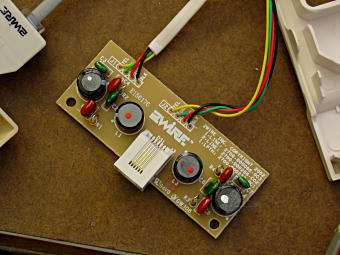 The filter circuit board itself. Pretty simple, really, containing a couple of choke transformers and caps. [See its linked bigger picture.] There is a filter circuit per line pair, total two, and the circuit is roughly thus, with cap values given in "multiplier" format as marked: