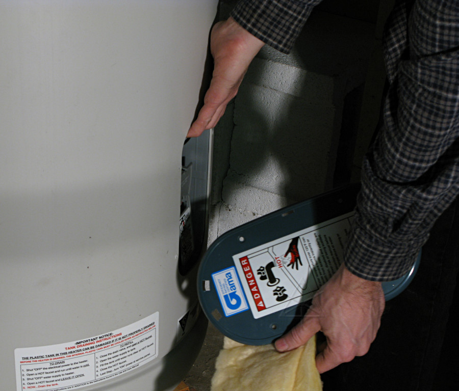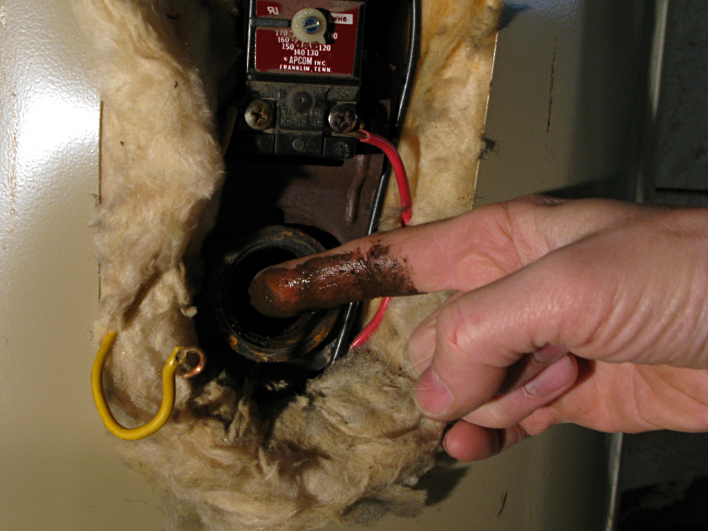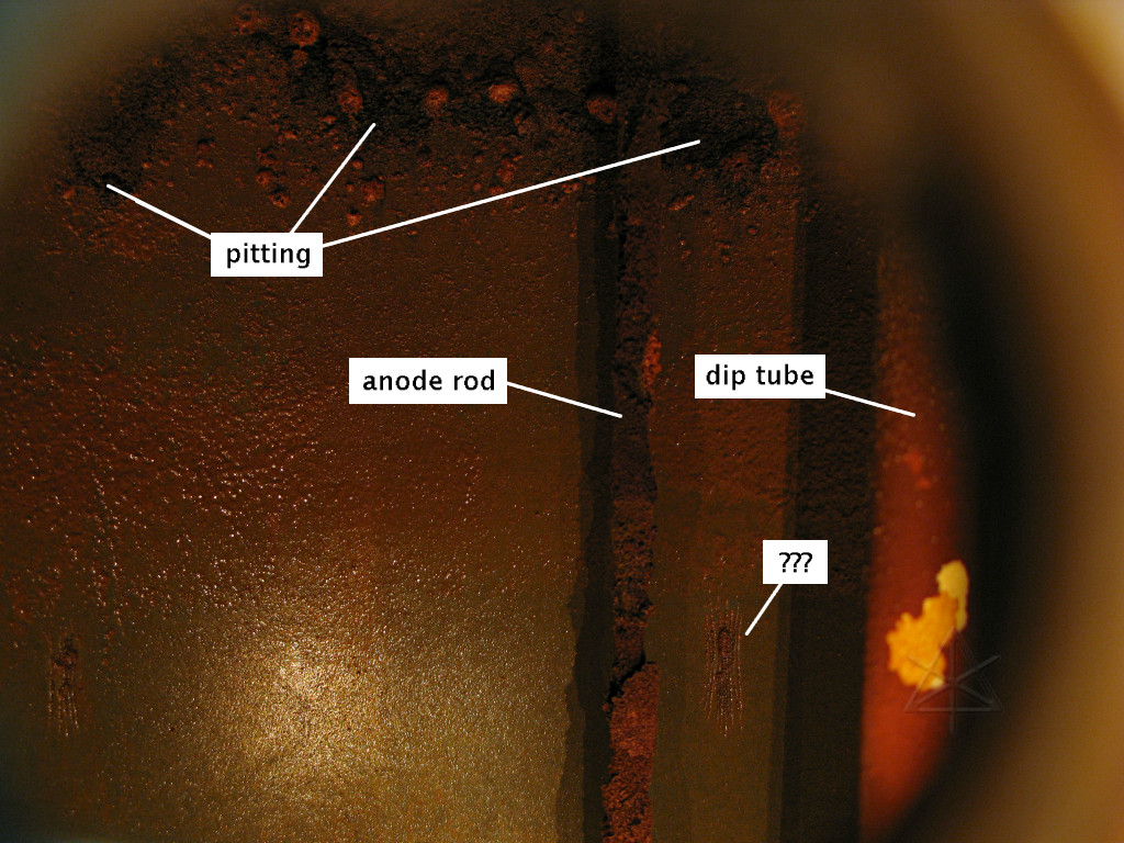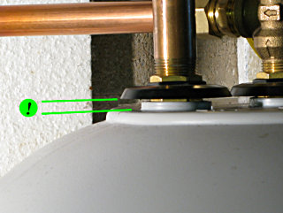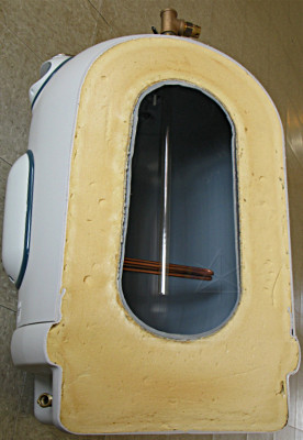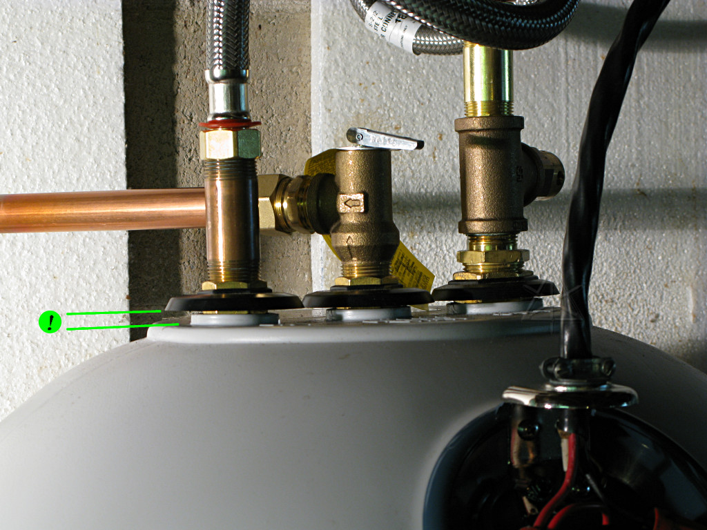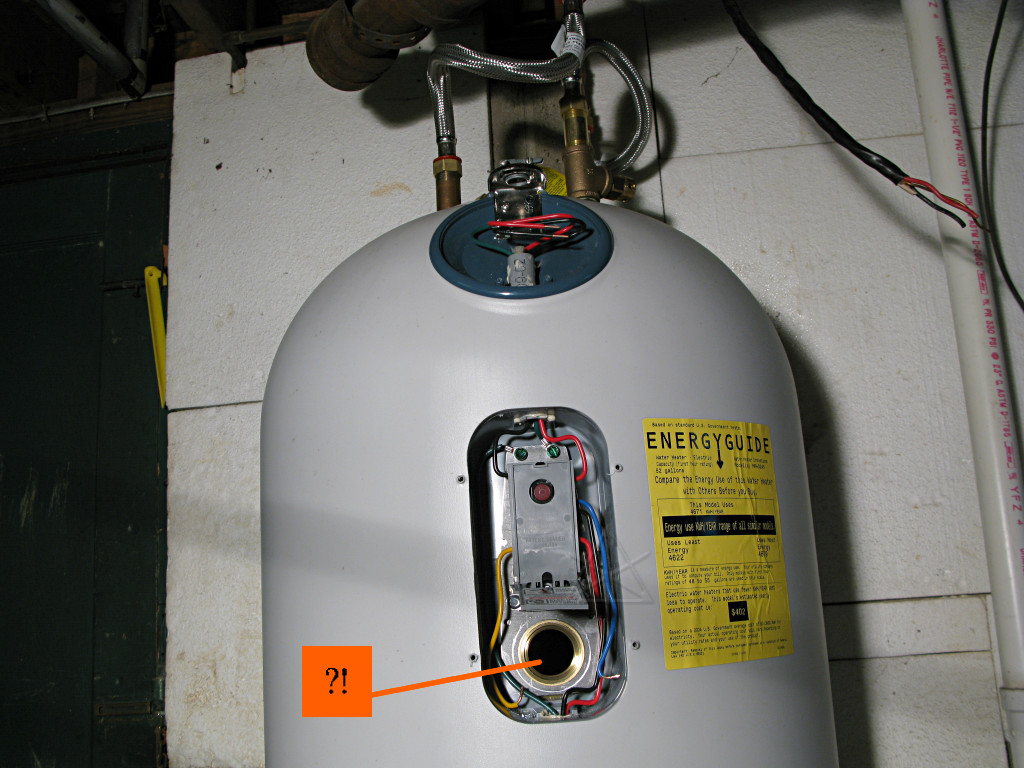 well, you're absolutely *NOT* going to believe this. Everything was going along fine ... got the old tank out of the way, the new piping done, including a new ball valve for the cold- side shutoff which was a slightly more ambitious way to go at the plumbing ... all soldered up, leak-checked okay, the floor site cleaned up and reworked with some bricks and shims, and the tank into place ... and then I just *happened* to pull off the top thermostat cover for a quick looksee, and guess what's *not* actually there? The top element. There's a huge HOLE in the side of the tank where it would have gone in, and two non-connected wires nearby. I wanted to fucking cry. Naturally nobody's home at said small-town power company on Sunday, so it looks like I ride out again early tomorrow to have them rectify this situation. Hopefully I can still bring the cold back online and at least have *water*, and in theory the new ball-valve will hold it from going into the water heater better than the corroded old thing I replaced. Good thing I checked, huh? I'm going to have some lunch, go do the electrics, and then sit around and sulk.Obviously, if I had gone ahead and tried to fill the tank, bad things would have happened when the water reached this level. So I was stuck, and back to cold-water-only configuration. I did run some water into the tank anyway and about half-filled it, just to get some weight onto the bricks and make sure everything was sitting level and so I could run some water out the drain valve and flush out any cruft that might already be at the bottom. When the Princeton Light folks finally found out about this, they were falling all over themselves apologetic and as near as they could figure, someone had "temporarily" pulled an element from one of the tanks in their stock to do a quick repair for a customer and had failed to order a replacement, after which I happened to get that violated unit. A mostly honest mistake, although it's incredibly lame that someone took the time to put all the covers carefully back on as though nothing had happened and didn't bother to LABEL the heater as incomplete in a rather hazardous fashion. How long does it take to slap on a piece of white tape and write "no element" on it?? They agreed that they really needed to keep a stock of spare elements, to replace this one and to avoid continuing to move a floating "hole" around between tanks. |