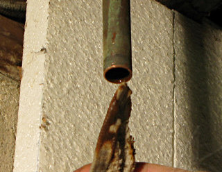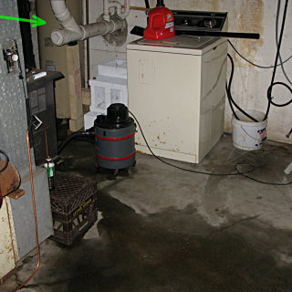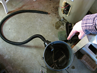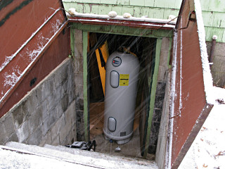 Anyway, this radically altered my priorities for that evening and I began triaging. After shutting off the cold supply to the heater [fortunately the valve, under its centuries of green encrustation, still appeared to work and didn't crumble in my hands], I worked on slurping up the water with the wet-vac and dumping it outside the basement bulkhead. Then came the problem of emptying the heater so its remaining contents wouldn't also leak out, assuming the leak was near the bottom. The drain stopcock was all of an inch above floor level, which does no good in a basement with window-level grade all the way around the house and no sump well. Those common diagrams showing how to blow down a water heater into a "nearby convenient drain" were all for naught here. However, the wet-vac hose fit very nicely over the stopcock outlet and I was able to drain the heater by sucking out a dozen or so vac-tank-loads of water and dumping them outside too. It took a while and was very noisy, but at least now I knew that the leakage was stopped. After things felt like they were under some semblance of control did I think about grabbing any pictures, because something told me this was the start of a somewhat involved project. I thought it rather ironic that water heaters had just recently been a subject on a local homeowners' mailing list that I'm on, with a couple of other people asking for recommendations on, uh, very short notice. |