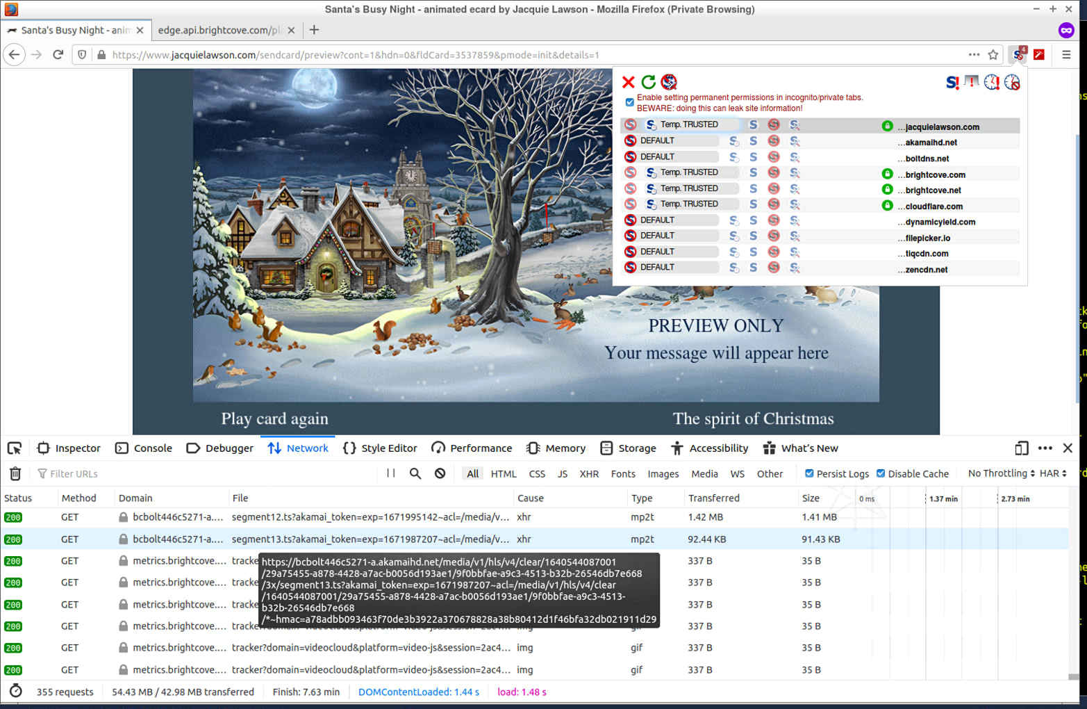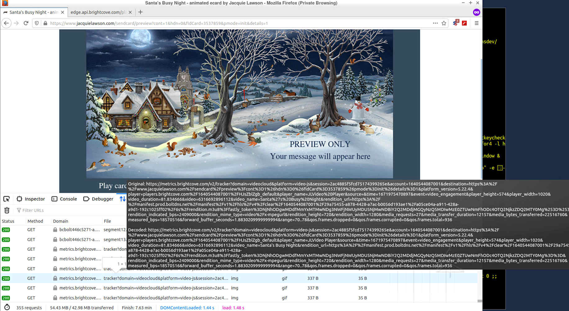 We finally get the animation to play, which is loaded in segments from Brightcove. Sure, it's cute, and we can't entirely fault the artists for the work they undoubtedly put into it -- even if it's later exploited. At the same time, Brightcove is desperately trying to track us as well, by loading several tiny invisible 1x1 .GIF images from their "metrics" site, via links keyed specifically to our activity. Whether we wanted to be part of their demographics-collection or not.