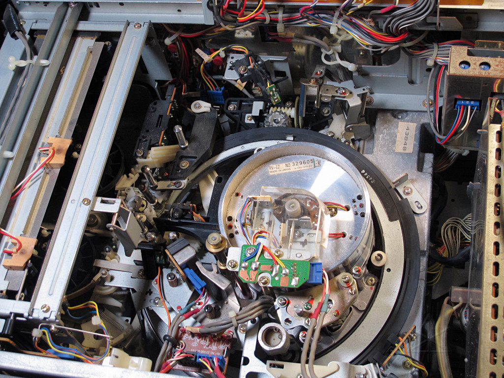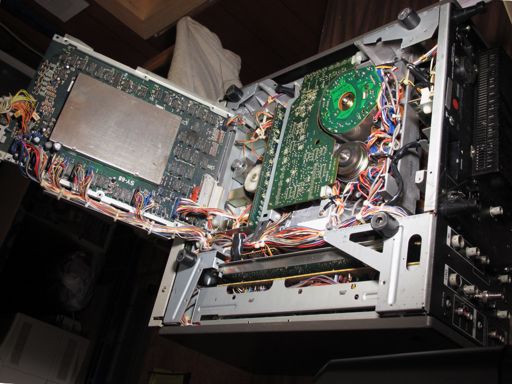 Even though the gargantuan old U-matic deck I owned back then was already archaic at the time, it could deliver fairly clear content so I had used it to assemble up random clips of this and that. It wasn't an editing deck and didn't even have a proper pause control, but by sticking a small screwdriver down into the right place in the transport and quickly wedging the pinch-roller arm off the capstan I could usually get a crisp enough pause for my, uh, "work". Looking back on it that was hilarious, but real editing decks of that caliber were out of reach for most not-all-that-serious hobbyists. I could live with a few frames of rainbow squigglies here and there, but it really brought home what a manic-depressive sort of activity video editing can be. Especially on that old iron. Fast-forward to today, and computers had finally gotten fast enough to do fairly good video capture into mildly compressed but high-quality files. Time to convert some of that old stuff to digital format for supposedly easier archival! There was one particular "wedding video from Hell" that I wanted to recover and distribute, as it represented the pinnacle of my so-called editing ability and would be a nice retrospective of our social community from back then. I couldn't even remember which format I had mastered that one on, as I think I'd given that to the, uh, "clients". While most of my source material was on a small stack of 8mm tapes, I wanted to see what I had on U-matic that might still be useful [and if I could start getting rid of some of those oversize cassettes, that couldn't hurt either]. But my ancient deck had long since headed for the electronics-recycle, and I needed to borrow another one long enough to dump out what I had. The local tech community delivered, in the form of a still-working Sony VO-5850 editing deck, with flying erase and a jog knob and everything. Well, said to be working, but it couldn't hurt to inspect the innards first as these things generally want a good cleaning after sitting in someone's storage before being trusted for optimal playback. [Thumbnail images link to larger copies.]  |