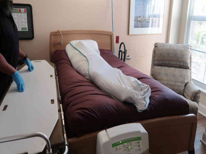 cranked up to its maximum height, he wrapped Mom up in whatever sheets were