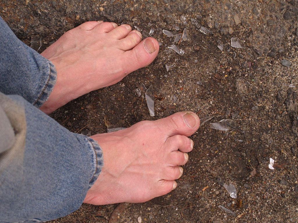 ![]() | I have become entirely convinced over the years that the common prejudice against not wearing shoes in various public settings is nothing more than that, just outdated social stigma and groundless discrimination. Nowadays the numerous health benefits of going barefoot are well known, and the internet has allowed people experienced in the shoeless lifestyle to communicate with a wider audience. Personally I've been mostly barefoot since 1980 or so, including in all my places of employment, over as much of each year as I can manage while living in New England. It is *so* much more enjoyable, freeing, and convenient than feeling obligated to cram myself into shoes all the time. And yes, quite safe for those accustomed to it -- and building up the soles to handle almost anything only takes a few months to achieve, starting from "tenderfoot" status. I walk over bits of broken glass and similar debris all the time, and it doesn't bother my well-conditioned "dog pads" any more than small gravel. |