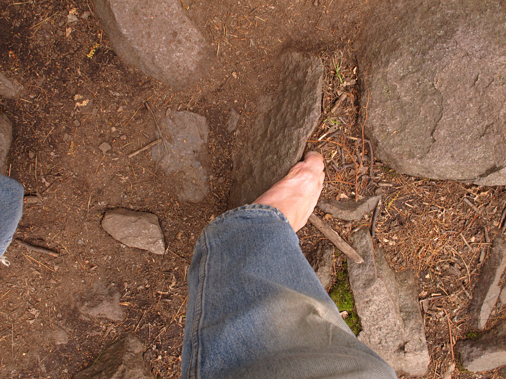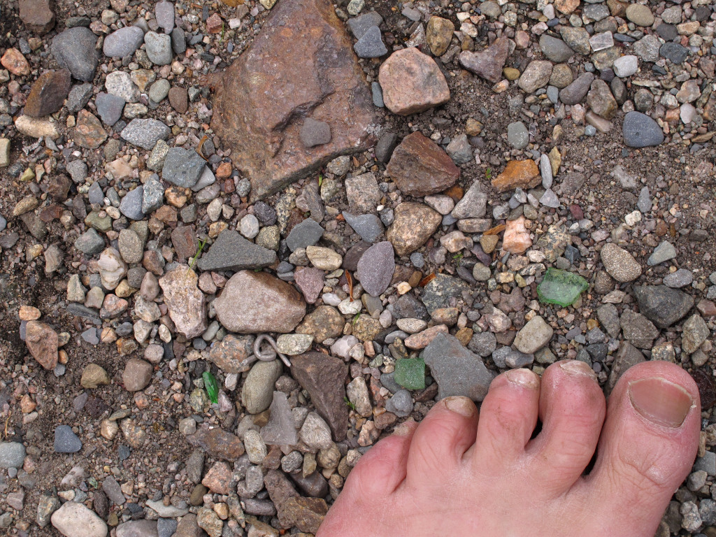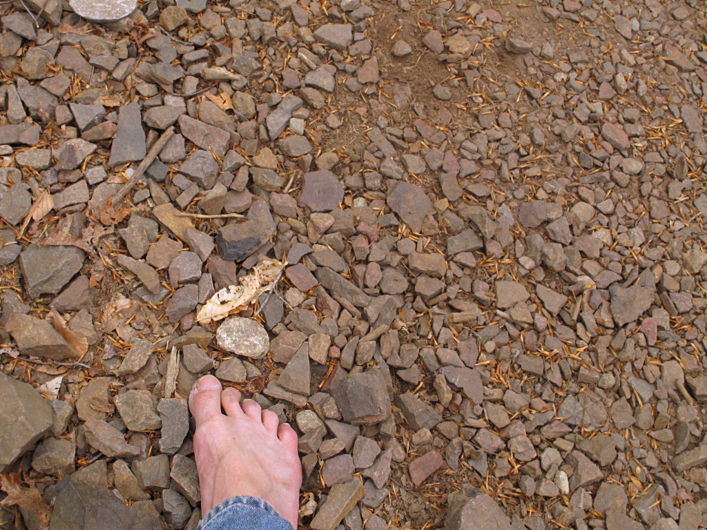 Of course no foot, human or animal, is proof against everything. A few scrapes along the sides or thinner-skinned arches can be a minor annoyance once in a while, but aren't going to ruin the day. Intentionally-injurious organics such as thorns still present a problem, and in my pack was the backup pair of china-flats to use as a tool to handle such things if I needed it. I've had my obligatory run-ins with prickly pear and other Western succulents; it's not fun. But most circumstances of hiking don't require any particular level of insensitive stomping to navigate competently, especially on these trails, and for me the agility benefits and total sensory experience far outweigh the perceived risks. None of the comments/questions I got that day were derogatory -- the fact that I was out there mixin' it up in the woods with everyone else and hauling ass in the process seemed to garner little other than admiration and respect, even if with a slight hint of "he's a crazy-man!" attached. The word "brave" was heard quite a few times that morning. I clearly impressed a few people who seemed likely to be the type to begin experimenting on their own, which is about all I'd hope for in terms of external influence. All in a day's work. And I didn't have to wrinkle my nose taking off stinky shoes and socks after getting back to the car; I just rinsed the DEET off when I got home. |