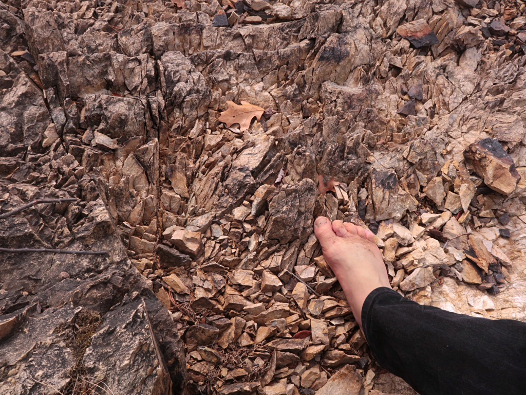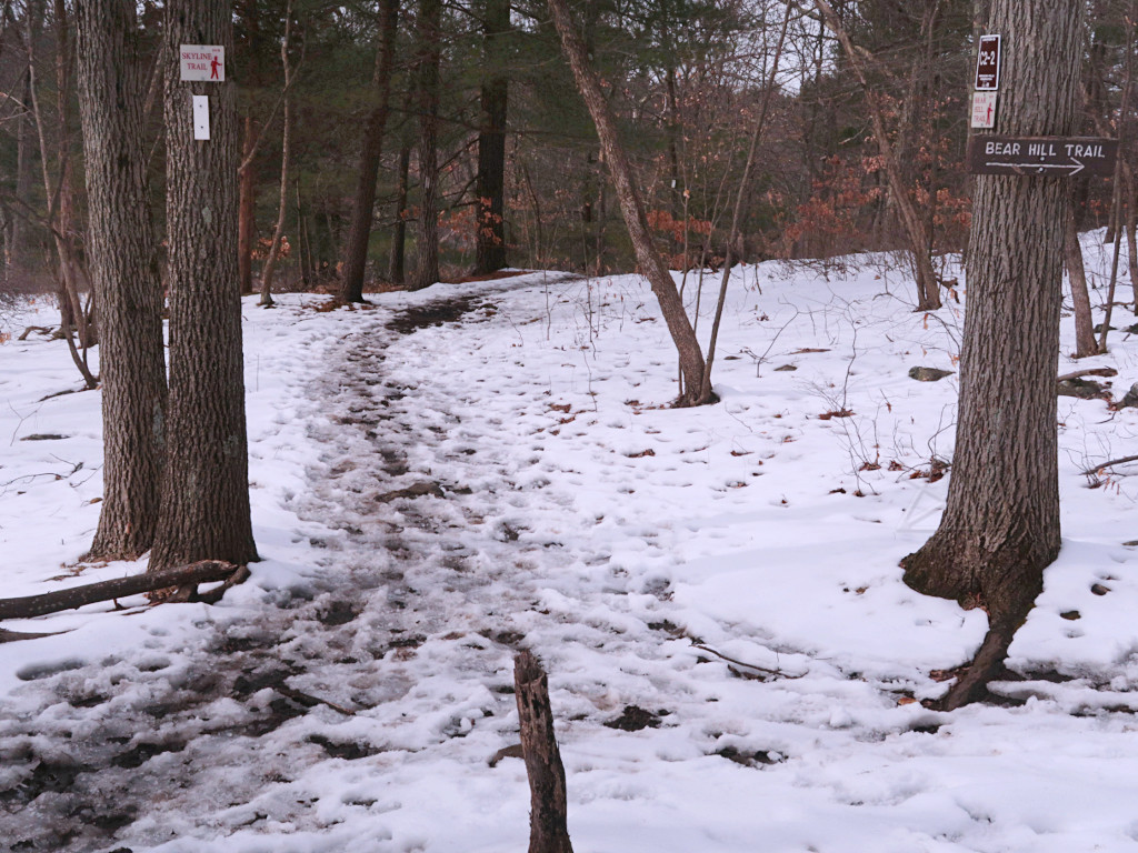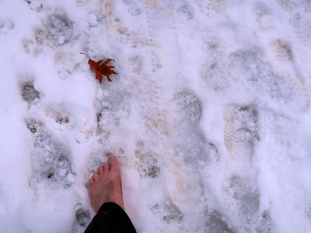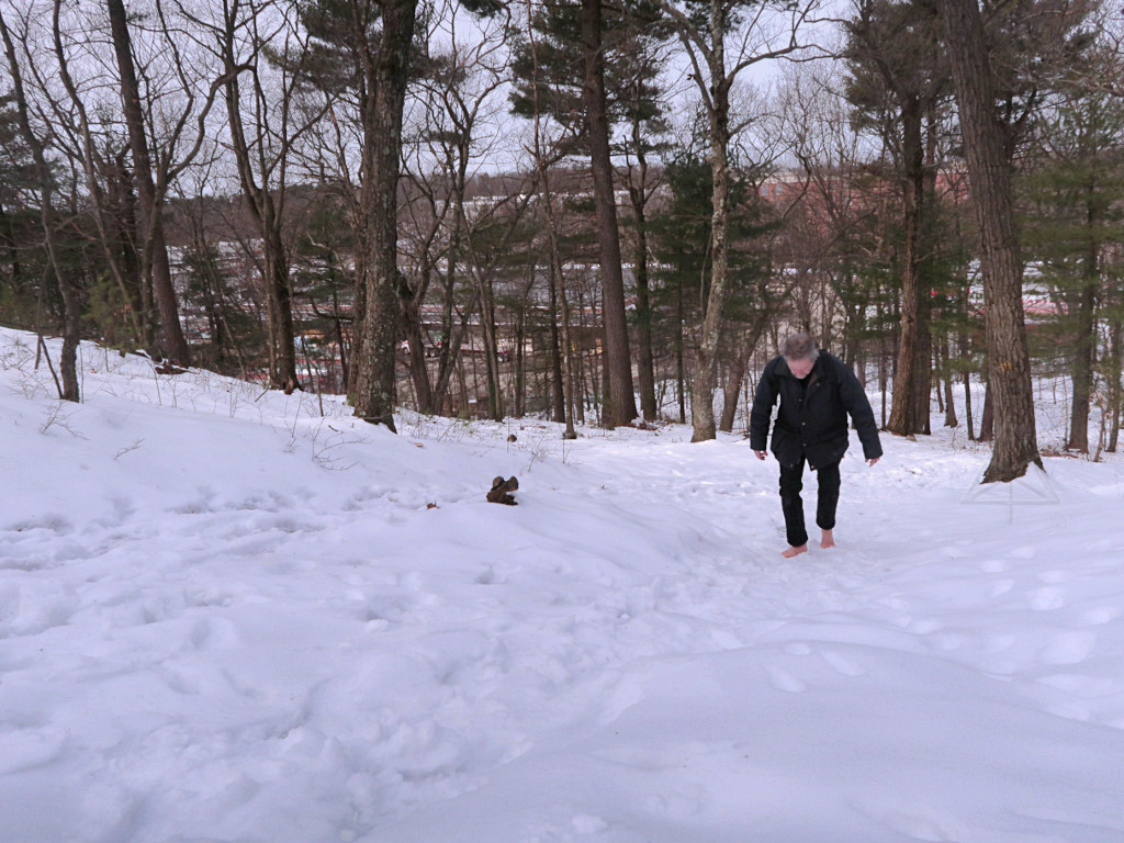 A midwinter day, snow on the ground, and another storm on the way. The ideal time to go barefootin' around someplace fun! As temps climbed up to around 40F on a day I was headed for a social gathering, I decided to check conditions in the Fells on the way over. Instead of messing around finding group hikes like a year before, this would be a quick solo blast around as far as I felt up for at the time. It was a month and a half after my stupid calf injury and at this point it felt pretty solid, only giving a mild reminder once in a while on heavy dorsiflexion, so I figured I was okay to hike. A few short jaunts closer to home had pretty much confirmed that. |