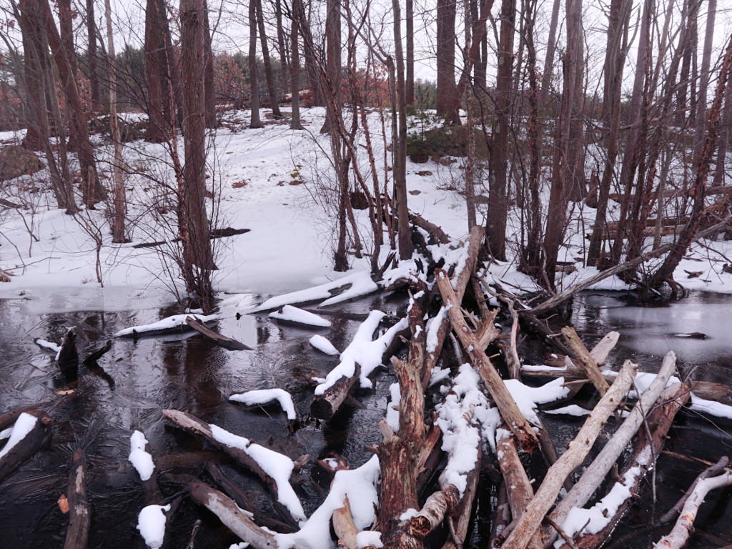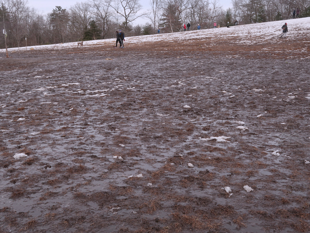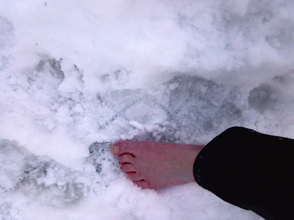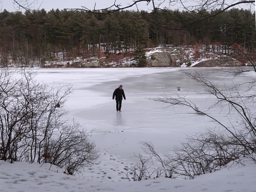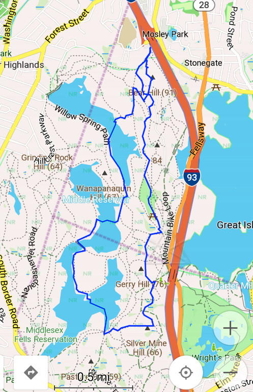 A midwinter day, snow on the ground, and another storm on the way. The ideal time to go barefootin' around someplace fun! As temps climbed up to around 40F on a day I was headed for a social gathering, I decided to check conditions in the Fells on the way over. Instead of messing around finding group hikes like a year before, this would be a quick solo blast around as far as I felt up for at the time. It was a month and a half after my stupid calf injury and at this point it felt pretty solid, only giving a mild reminder once in a while on heavy dorsiflexion, so I figured I was okay to hike. A few short jaunts closer to home had pretty much confirmed that. |