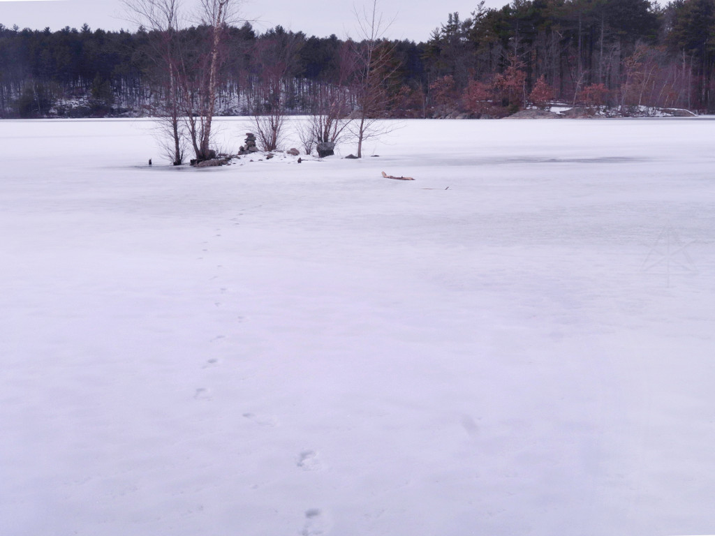 Way behind me is the North Dam in Winchester, which is again part of public water resources, and the Fells trails run right over it at that corner of the reservation. I opted to head straight across to the nearer shore, though, and find the trail along that side. If anything the lake ice and snow-crust on it out here felt warmer underfoot than the stuff in the woods, and it had a fairly fine and nicely grippy texture to it. My toes has been enjoying the glowing sensation from vasodilation for a while at this point and the calf was still feeling okay, so I was good to go for plenty more distance. |