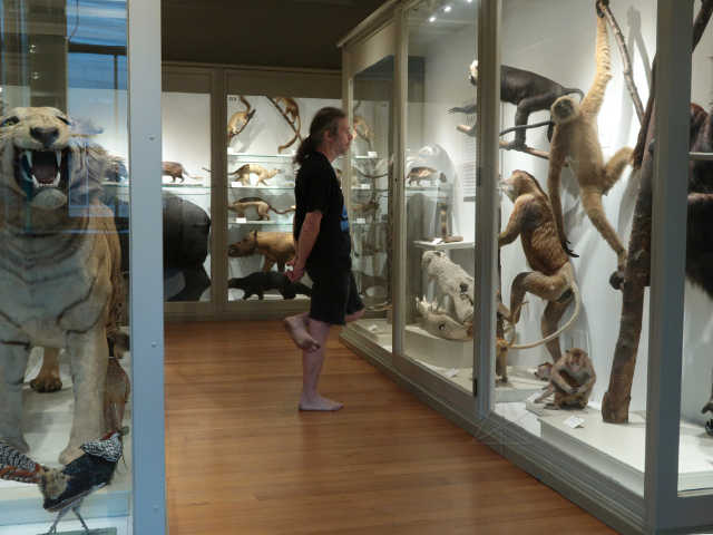 http://hmnh.harvard.edu/plan-your-visit This was a totally new one on her, and she freely admitted to being a bit flummoxed by it -- even at a college, nobody had expressed a desire to come in barefoot before to her knowledge. We assured her that we were fine in just about any kind of terrain and that neither the Museum or the University held any possible legal liability for our feet. We expressed confidence that their gallery floors were pristine and it was no problem for us at all even if they weren't. She really didn't want to turn us away, especially as visitors who knew something about the place already and were clearly intelligent, well-meaning, and enthusiastic to get a fresh look at what it had to offer. She gave us our little clip-on tickets, and we spent a lovely few hours padding quietly around taking it in and blazing away with cameras. No other staff who occasionally passed by made any hint of disapproval, which was interesting because I don't think Kristen had time to frantically run around behind the scenes assuring all of them that we were okay. But maybe she tried, just for completeness? It seemed that they really didn't care either way, which is nice if true because usually it's the uppity underlings who cause the problems. I even had a couple of completely positive and instructive interactions with other visitors whose eyes were definitely opened. There I was, a living piece of "natural history" right in front of them. I snagged an amusing timed-selfie in the "mammal room", which I'm tentatively captioning "This is *evolution*?!" ...