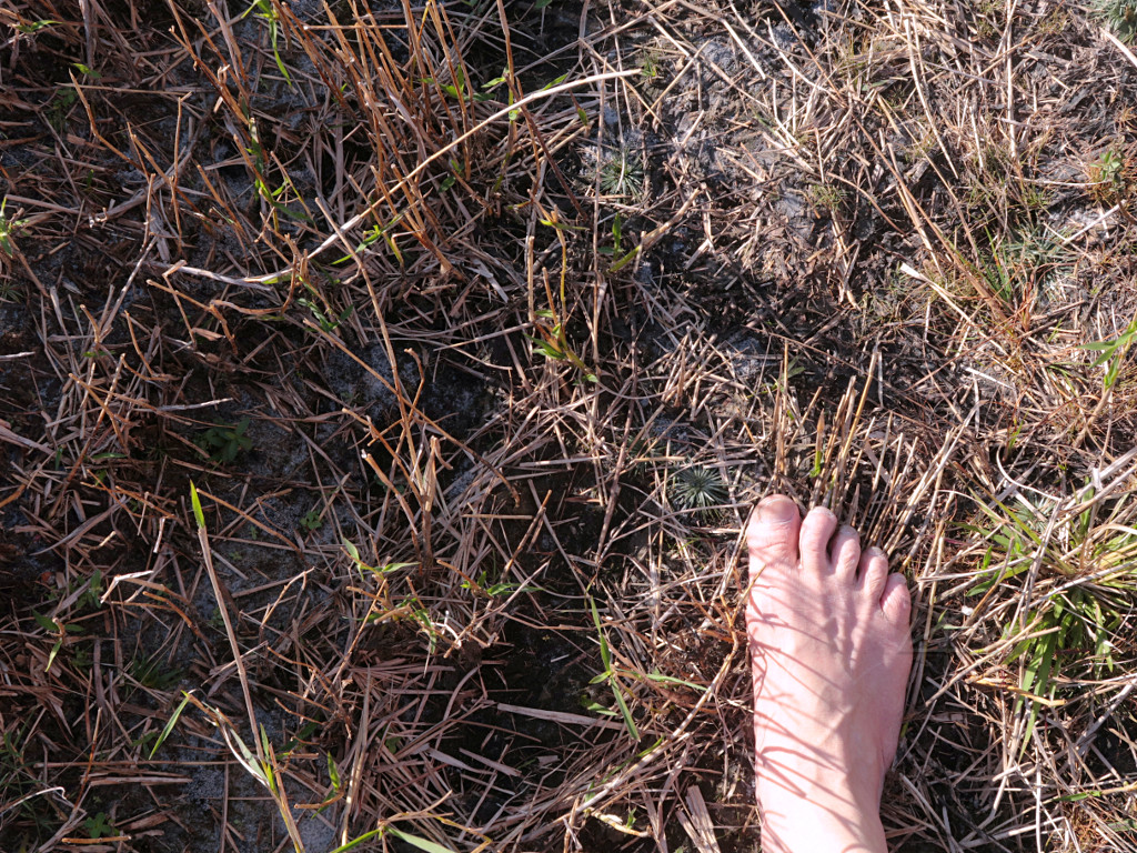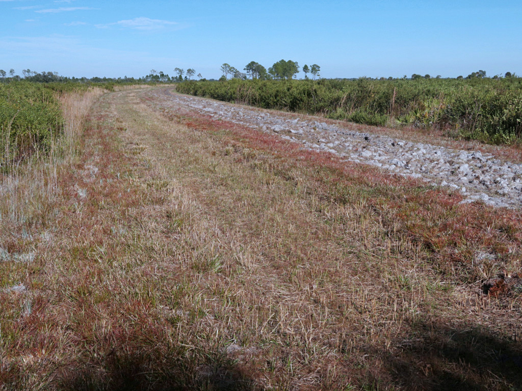 The narrow trail finally emerged into a huge open area. To attempt to photograph the breadth, I went up a convenient tree a little ways for the left-hand shot. Now I was at the "all-weather road", which stretched away to the north with no end in sight -- this was the other half of my loop. This is the prairie land, which constitutes most of the area in the park. This had the same sort of firebreak, not the full width of the slightly raised roadbed. This was going to be something of a slog, trading off between the tumbled rototill and the spiky rough-cut grass for another two miles or so. |