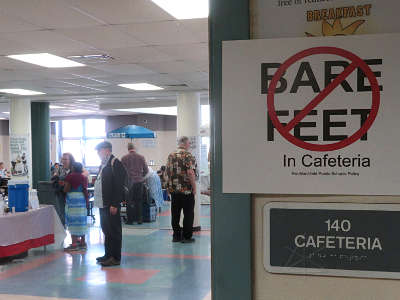 It all started during the 2017 festival, when a friend of mine who was relatively new at the barefoot thing but really enjoying the benefits, was sitting quietly in the cafeteria minding her own business, and one of the Mansfield school staff decided to come over and start harassing her. My friend wasn't yet really used to handling confrontations in her own barefoot journey, but tried to reason with the staffer, which basically failed over the din of a noisy room and led to some bullshit accusation that my friend was yelling at the staffer in an aggressive fashion. Absolute crap -- having any conversation in that room at peak mealtime is difficult at best, and it was all extremely upsetting for my friend. News of this rapidly reached me, and I steamed over to the cafeteria to find this person and try to get things straight. The offender turned out to be some kind of kitchen supervisor for the school, a rather large and arrogant woman who clearly derived satisfaction from her day-to-day power trip over a bunch of middle-school kids. I laid it down that NEFFA had researched all of this previously and that any such harassment of *our attendees*, responsible adults with their own lifestyles and decision-making capability, was unwarranted and wholly unacceptable. Plenty of people were barefoot all over the rest of the facility all weekend, and the cafeteria or any other food-function area was no different. No, it was not a "health code issue" related to food service either, and I stood there deflecting various other typical excuses. She seemed to genuinely not know the facts, and expressed surprise at what I was saying. I handed her an Outbarefoot card, as it was all I had convenient at the time, and asked her to research these things for herself. We managed to end the conversation cordially and finish out that 2017 weekend without further incident, but it was a warning of things to come. In reasonable advance of the 2018 festival, I reached out to some of the NEFFA staff I knew how to contact, to get assurance that we were still a foot-friendly event. A month-plus out, it seemed like we were all set -- certainly, nobody within the NEFFA committees had any issues. Then, two weeks before the event and far too late for any corrective pre-action, it emerged that we were not. The cafeteria was being clamped down on again, in a way that had evidently sneaked itself into the year's contract without anyone noticing. The entire ensuing email thread, somewhat sanitized, is readable here. Note the timestamps carefully -- things were not helped by the long delays in responses from the NEFFA end, where prompter action might have been able to head off the problem. So here we were, backslid into the same sorry state as three-plus years ago, but now it was coming from our venue instead of NEFFA itself. I agreed to uphold my commitments to the event and showed up to work my ass off as usual, but several of us were still really angry about the situation. The school pasted up some really obnoxious signs at the cafeteria doors: and as the weekend went on it became clear that I had been flat-out lied to about our non-cafeteria options and outdoor vendors -- if we hadn't brought plenty of our own food supplies, the choices all weekend would have been trolley-dogs and pizza. The school people even stuck their signs up around a small snack/break area in the building I spent most of my working time in, which had been my usual convenient source of coffee for a couple of years. Clearly, someone had all the wrong paranoid brainwashing about food functions, and was pushing their offensive power-grab as far as they could. We made it through the festival and it was generally okay, and when I sat in on the on-site NEFFA board meeting there seemed to be general sentiment that this really needed to be fixed, *again*, for next year. I wondered if it was our same foot-phobic kitchen staffer behind all this, or someone higher up the food chain, so to speak. I came close to filing an official complaint with the school board, but agreed to hold off until the NEFFA negotiators had the chance to get through all of their own discussions. |