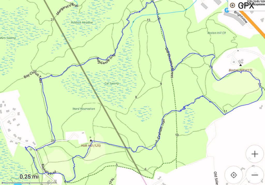 I bade the group a fun rest-of-their-day and struck out along the Graham trail, which was also reasonably well traveled and pretty easy going down into the thicker woods. There was a *lot* of stuff down from storms, and like on other hikes around this time I kept stopping to throw or drag stuff off the trails. The Trustees folks probably hadn't really been out here yet after the most recent storms; there's only so much that crews can get done in a week before the next smackeroo comes along! A lot of it was larger than I could lift or push, and would need tools. |