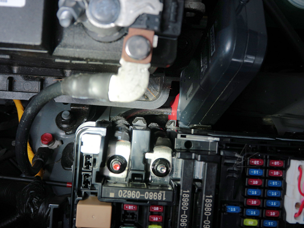 After something like *20 minutes*, the current finally dropped to where the clamp-on couldn't accurately measure it anymore. A quick test with lifting the negative terminal off its post while bypassing the connection with a milliammeter showed the fully quiescent current down to 16 milliamps. That's acceptable, and a 40 or so amp-hour battery should be able to hold that up just fine for many days -- as long as you do *nothing* with the car. As soon as anything changes, like clicking the RKE or opening a door, all those standby systems power up again and the whole slow 3-amps-to-trickle dance happens over again. Turning off the memory-keepalive "fuse switch", visible at the very top of this shot, reduces base quiescent current to 5 milliamps. The car can easily be left "mothballed" in this state for a month or more, without the 12V going anywhere near flat. The only caveat is that the metal key needs to be used for initial re-entry, as the RKE and smartkey functions are essentially disabled in that mode. Turning this switch off seems to lose very little information, notably just some climate settings. Other stored information like driving modes, radio presets, charging schedules, etc -- settings we would *expect* to lose -- appear to be preserved regardless. Perhaps they're stored in some kind of flash RAM instead. One thing to note is a distinct possibility that "final" sleep current may occasionally be a bit more in other Konas due to their cellular modems still exchanging data to the BlueLink network. This may drain a battery faster, as noted later in that same forum thread, from someone who put his own BlueLink setup in a confused state. In *my* car the possibility for that has been permanently eliminated, by the means described in the "going dark" section. My reading was also taken without the "battery care" user option being enabled, which supposedly brings on the traction battery and DC/DC automatically once in a while to push a little maintenance charge into the 12V. But that's more electronics needing to stay powered and working to keep track of the 12V voltage, time, or whatever its criteria are, which may be more of the idle overhead it supposedly works against! There is evidence that the implementation of this in the Kona is fairly flawed and often results in a dead 12V battery anyway, so it doesn't seem worth using in the first place. I didn't bother to test this further; understanding the steady-state characteristics of my rock-bottom quiescent drain gave confidence that I could disable the "care" option and not worry about it too much. |
