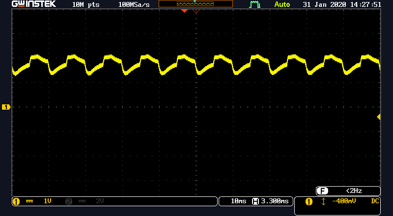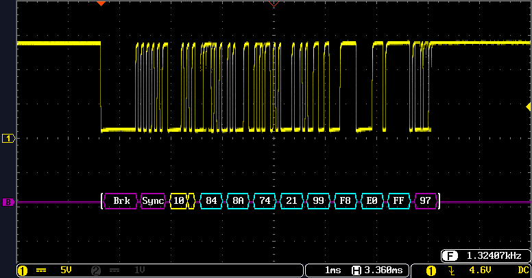 At some prompting from KiwiME on the forum, I fired up the DSO with bus-analysis enabled and observed that the little two-wire connection is indeed a data line, running a typical low-speed automotive protocol called LIN, or Local Interconnect Network. This runs at all of 19.2 Kbaud, but it's only sending one little chunk of data over and over out that little IBS connector, back to the a "sub battery sensor" input to the main inverter/LCD/everthing-else electronics block. A very temporary tap simply involved a thin sewing needle poked through the wire insulation long enough to capture a couple of packets, and then the slight injury taped back up afterward. Without a solid connection that I could let go of to go mess with other things, it didn't seem worth trying to reverse-engineer the packet contents. |