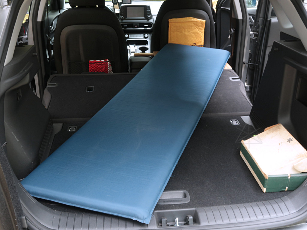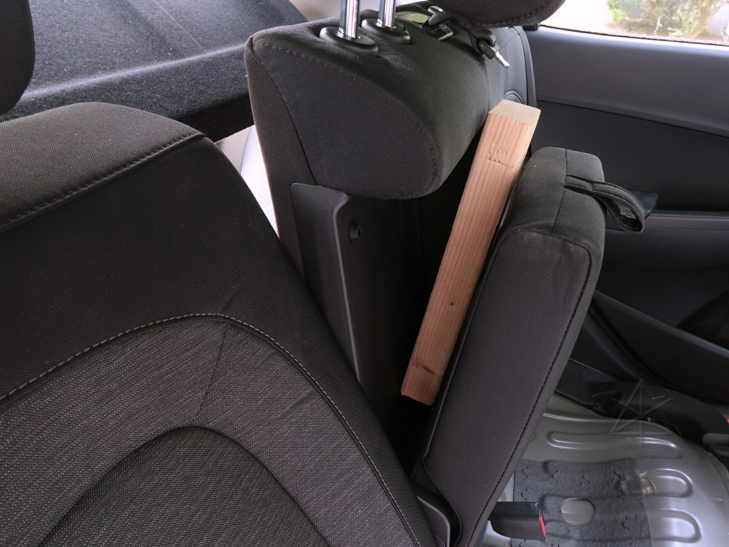 The Kona, however, is so much shorter that the whole idea almost seems infeasible at first glance for anyone but midgets. The interior parts also seem antithetical to the effort: the front passenger seatback cannot be moved over nearly the same range to get it out of the way or make it part of the open flat space. Trying to drop it all the way back comes up against a hard stop in a totally inconvenient halfway-down position, and even that angle wouldn't be comfortable for a quick snooze in the front seat itself. On a brief evaluation of the seatback mechanics I decided that trying to modify the pivot and allow more range would probably be unduly involved, so I took the approach of filling in more flat area a different way. Simply dropping the rear split seatbacks normally opens up more of the "boot" area but the surface is definitely not flat, it tilts up quite a bit at the pivot point. The rear seat-cushion is too thick underneath, so the answer is to remove it as it's not really needed for a travel/camping scenario anyway. [It is held in with two bolted tabs at the back and a couple of pop-out plastic clips at the front edge.] But then the seatbacks flop down too far, angling the other way. What it needs is just the right amount of support underneath to bring the seatbacks flat with the line of the rear floorboard. |