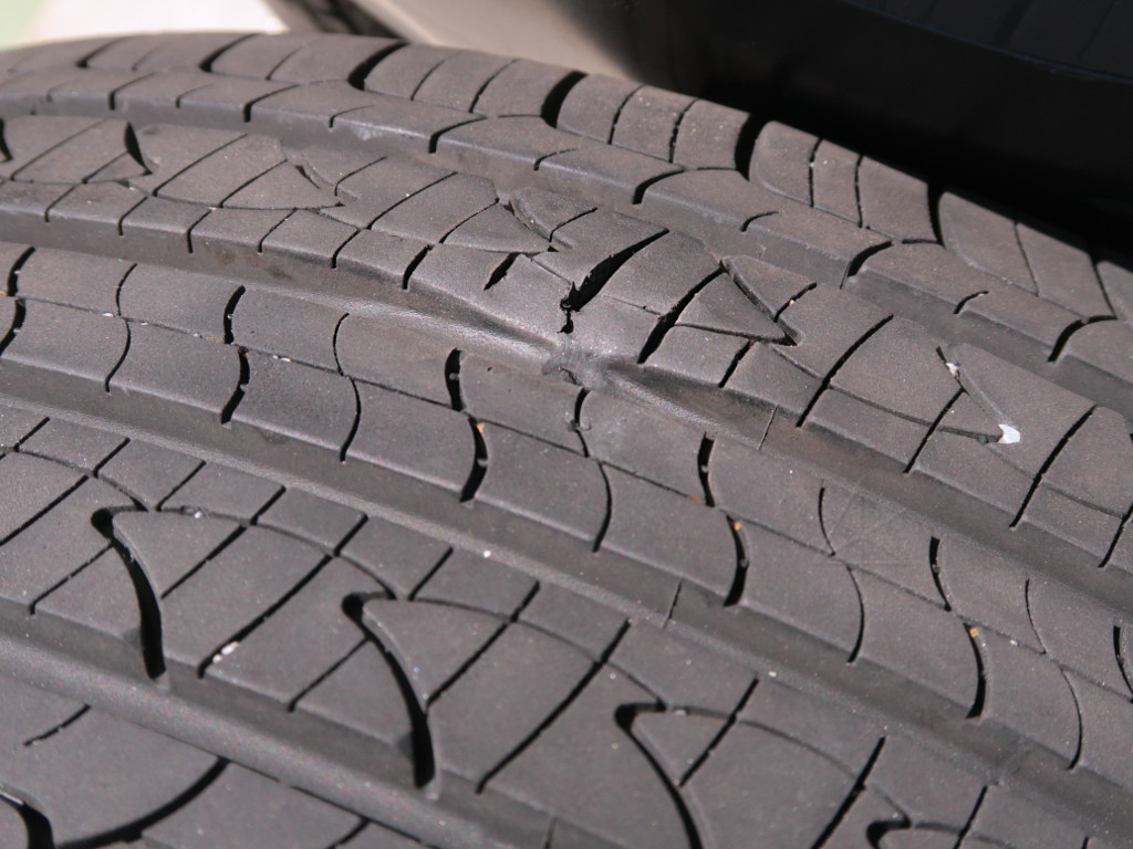 Really, there should be some way to arrange that people responsible for incidents like this get BILLED for everyone else's lost TIME, wasted while stuck in the results of their stupidity. This is why many people arriving at a backed-up section start laying into their hazard flashers for the benefit of those coming up behind. This stretch would have been a totally non-noteworthy few minutes of cruising along, rather than sitting there basically unmoving, surrounded by idling trucks who needed to get to their deliveries too, and watching the semi-frozen drip coursing *down* the windshield instead of *up*. I managed to creep to an exit and bailed off, quickly charting a bypass route on back country roads, and found my way to my next charge just south of that mess. Now it was raining for real, cold and miserable. I do have a section of trash bag I can put over the charging port in such situations, clamped down under the hood, to try and keep the high-current electrics drier. After losing an extra hour on all that, I kept going, and got past Harrisonburg a bit where I pulled in for an unprecedentedly chilly overnight for the region and time of year. I had not brought the full cold-weather car-camping rig, only parts of it. Fortunately, I'd layered my 12V heated blanket under the sleeping bag, and if I hadn't included that the 35F overnight would have been basically impossible to endure without running the energy-wasteful cabin heat. I had also popped out the back of the storm by then, so I didn't get wet while in and out of the car prepping it for the night, and the next morning was still cold but beautiful and sunny. There were still snow flurries in the high country along the backbone of Virginia, and it was really amusing to see Spring happening along the roadside, with lots of flowers and trees leafing out, and a layer of snow on everything from the previous night. I got down to the "big drop" on I-77 at the NC line and things were starting to warm up nicely as I got some way into NC, so my spirits were improved. Then, the tire-pressure alarm went off. The monitoring system in the Kona shows the actual pressure, which I keep above its max display of 51, and I watched with some degree of horror as the number on the left rear tire rapidly dropped, first alarming at 44, then 35, then 26, and down to 15 as I was slowing down ... there was no time left to find the next exit and pull off somewhere safe, I had to just dive for the shoulder and get stopped before total disaster ensued. Knowing immediately which tire it was helped me decide how far to squeeze over and leave some workspace still on the asphalt of the shoulder. I got out to inspect things, and could clearly hear the remaining air hissing out as I bent down to assess out the damage and locate the hole. Given that the door-placard pressure for the stock sidewall-51 PSI tires is 36 PSI but it alarmed at 44, it's clear that the TPMS also observes the *rate* of pressure drop to detect a rapid leak situation. Clever of it, and damn useful as it gave me a precious few extra seconds to evaluate the situation. The specialty aftermarket spare wheel I'd ordered from Modernspare.com paid for itself that day. I had to uproot my sleep rig a bit to get to it and the jack kit under the rear deck, but didn't have to unpack the whole car like I've seen some people do. So there I was, on the shoulder of a respectable downhill along I-77, jacking the left rear of the car up and swapping wheels, with semis swooshing by at 70 MPH a couple of feet behind my head. But having the right tools meant that I could get moving again in short order and get myself out of that death-trap, and to then go as far as the next charge point where I'd figure out what to do next. Something about the appearance of the puncture didn't look simple, and once again, technology to the rescue: I decided to google up local tire places and have professional eyes on this before I attempted a simple plug patch. I carry one of those plug kits, in addition to the spare wheel, jack, lug wrenches, and plain old hand pump. Because you just never know when this sort of thing is going to happen. And there's no way I would try to rely on the shrill little compressor and "goop kit" to quickly get out of a bind, which is what Hyundai gives you by default. Many people don't seem to realize that topping up car tires is totally doable with an ordinary bicycle floor pump -- in fact it's less pressure than in a bicycle tire, just a lot more *volume* to be transferred in. So while waiting for an inordinately slow charger, I started calling around and longer story short, found a local place that would take me as a walk-in and could examine things and do a proper patch job. The shop was all of a half-mile from where I was sitting, and the person on the phone said "sure, bring it on in!" By then I had enough charge to go one more short leg, so unhooked and a few minutes later, walked into a pleasant front room at the shop carrying my specimen. They were great; the desk manager Ashley I'd been talking to was friendly, professional, and efficient. She and some of the other women around the shop had that general appearance and demeanor we often see in, say, theatre tech -- a bit butch, if you will, with close-cropped hair and various body-art adornments, and very competent at their jobs. Respect! She wrote me up and rolled the wheel into the back, and I went outside into the now gorgeous day to wait for word. Which came very soon, except it was "you need a new tire". Not entirely unexpected, though. This was no simple puncture, apparently some of the belts were physically severed and thus unsafe to put back on the road. My suspicion about it being a more complex matter was confirmed. Here's what the exterior looked like: