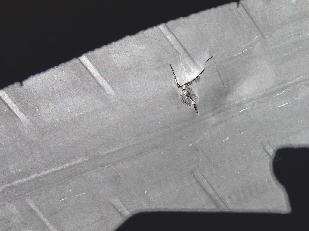 I didn't like how the tread-block looked either mashed or worn down next to the hole, and the disturbance in the siping next to that, which is why I wanted someone with experience to look at it. I agreed to a new tire, any old thing they had in stock of the same size would do, so they went ahead to change it. I went around to the open bay door; the tire machines were right there just inside, and I chatted with the guy doing the work and asked if I could inspect the tire once he got it off the rim. He handed it to me and I got a good look at the *inside* surface. This is with my finger pushing in a bit from the tread side: