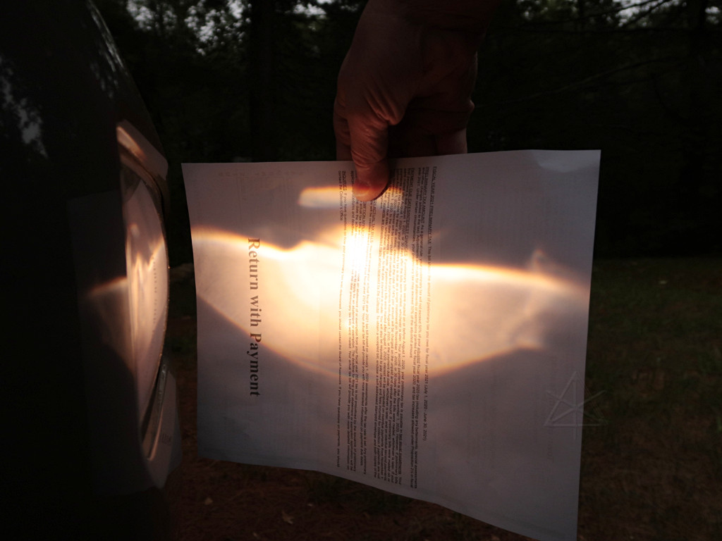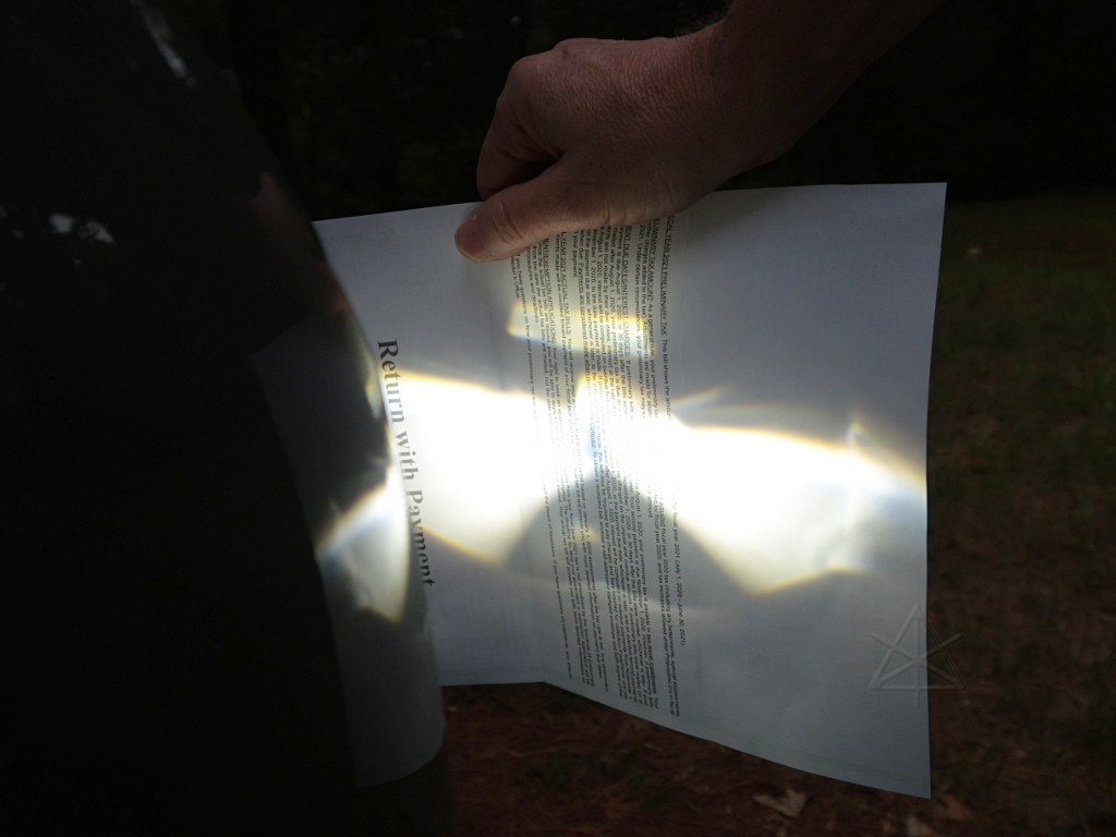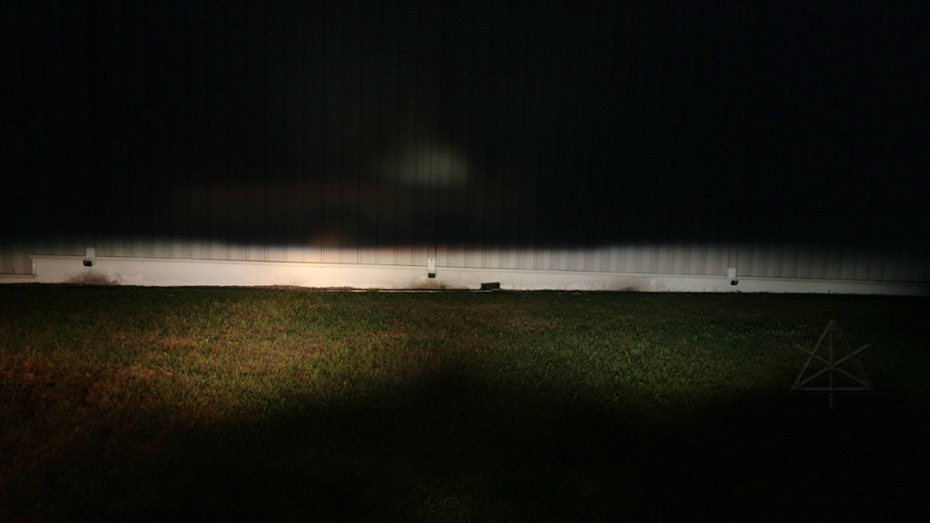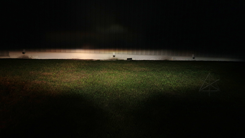 So I needed to go find a wall with clear area in front of it, where I could park a good distance away and aim the car straight toward it. For this test I installed ONE of the modules and left the other side with its original halogen, to compare the two throws at a distance, and went tooling off into the gathering evening to find a suitable test spot. This took a bit of searching around, as many buildings have obstructions between their surrounding pavement or are built on a bit of a rise above parking-lot level. What I found wasn't totally optimal -- the side of some industrial warehouse with a surrounding lawn I could pull a short way onto, but it would do for a first approximation. |