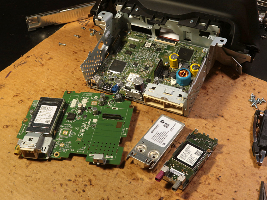 The whole unit went on the bench for disassembly, and from this point it was surprisingly painless to do what I needed. The unit manufacturer simply OEMs third-party modules and adapts them in; the daughterboard here carries the cell radio and the Sirius XM receiver. The cell modem is at the lower right here, with its cover next to it. Apparently made by "Continental", and designed for mobile applications -- it just plugs onto the daughterboard. Often the thru-tabs on such shielded box covers are soldered in, but these weren't -- just twisted a little once through the holes to retain it in place, thus very easy to straighten and remove. There's even an IMEI printed on the module, as well as on the label on the outside of the head unit. No obvious SIM, but these things are probably implemented as an "eSIM" memory block inside which allows for remote provisioning. Popular wisdom indicates that they're probably registered on some variant of Verizon data service. |
