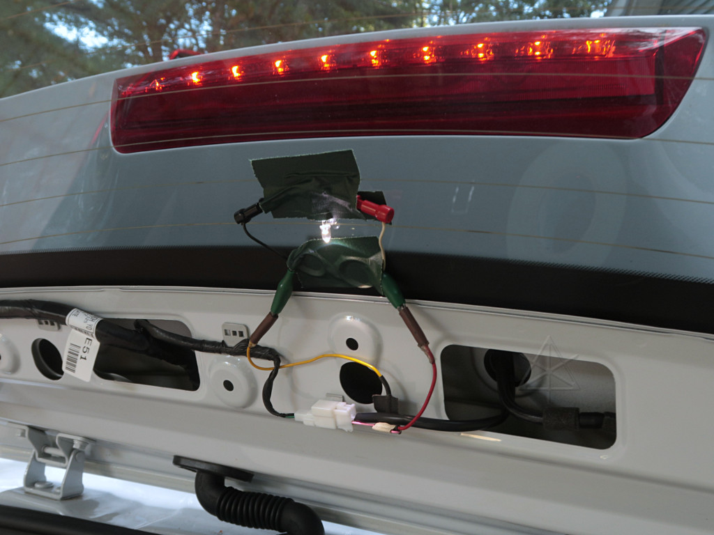 A question had come up on one of the forums about strong regenerative deceleration, whether use thereof would light the brake lights even if the physical brake pedal wasn't used in the process. The official answer in the relevant thread was that yes, above a certain decelerative rate the brake lights were *supposed* to come on but most folks weren't sure of the reality. To answer this question for myself, I put in a quick-n-dirty brake-light telltale by backpinning the third-eye connector into an LED taped to the back window and pointing forward, where I could see it in the rear-view. Without it there was no way to tell if the brake lights were on, and this was far simpler than someone else's hack of mounting a GoPro on the back of the car somehow. |