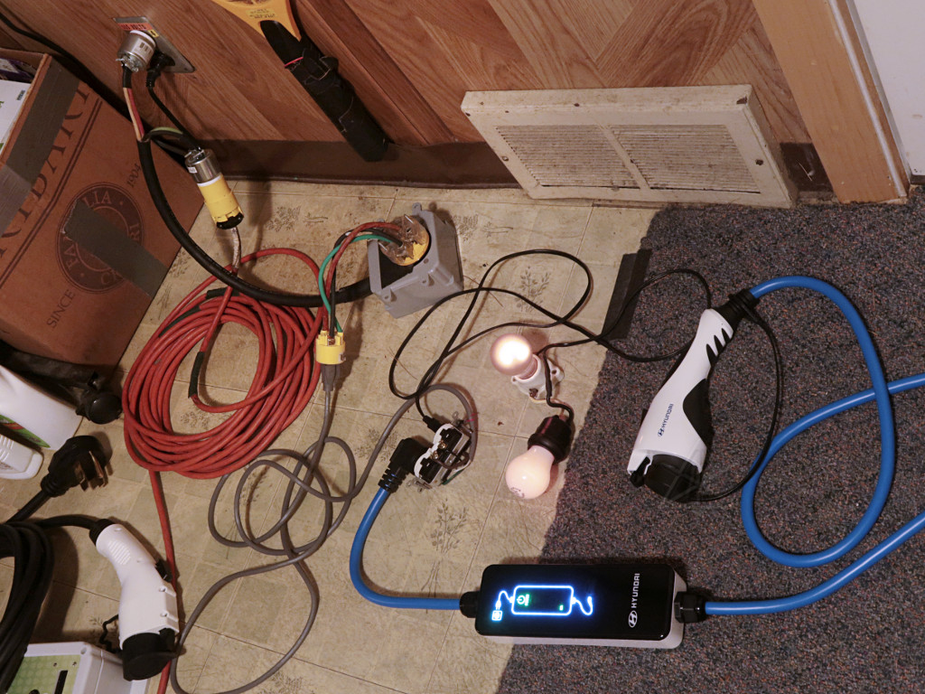 My Tour de Sol buddy up north had seen rumors that the small EVSE that came with his Bolt could run on 240V and double the charge rate of the car. This sounded entirely reasonable, as it's really just a relay box with some support and interface stuff added. Modern low-voltage switching power supplies, such as for the electronics to handle the J1772 protocol and energize the relays, often have wide ranges of input voltage so that they can run in US or European markets unmodified. Further supporting evidence can be found in this long-running thread at insideevs. I briefly looked at cracking the lid off the glued-together box of mine to look at the innards, but decided that doing so would probably be fairly destructive and that there were other ways to externally and safely test this theory without blowing the thing up. |