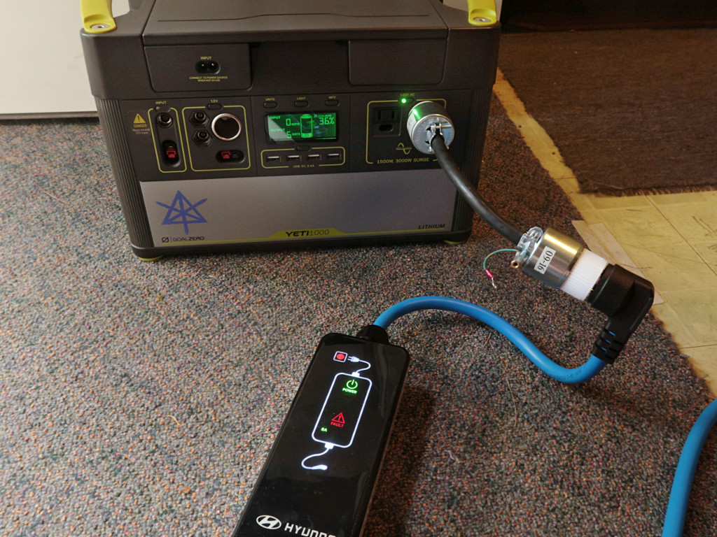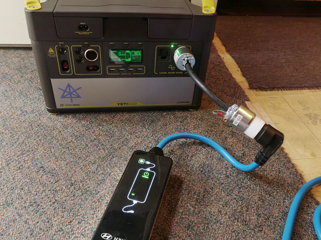 I then hauled that whole rig out to the car for a test, and the Yeti pack could charge the car at the full 12A setting on the EVSE -- maybe not quite 12 amps for real through this lashup, but the Yeti boxes are quite solid and can deliver an honest 1500 watts steady-state as advertised. So in theory I'd get close to its rated kilowatt-hour out of it top to bottom, less minor losses in the charging chain. |