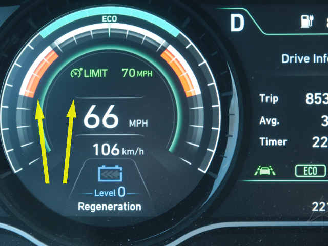 This would seem an unlikely topic for an EV, as their motors are generally very efficient through a wide range of operating conditions. One thing I got used to in the Prius was holding its combustion engine in its much narrower efficient running range, leading to extensive discussion of keeping it in the "sweet spot" of optimal load conditions. I got very used to locking my foot in the appropriate position for hours at a stretch, to basically drive in a constant-power scenario. Cruise-control is Right Out for any such experiments, as its response is far too agressive on even slight uphill/downhill changes and the Prius engine RPM and load would be all over the place. The result of holding steady power was a good bit of speed variation from the terrain, rather similar to what happens to a loaded semi with an underpowered day-cab. I found myself "pulling the hills" just about like they were, and would often just follow along a healthy distance behind a truck that looked like it was running about the same effective power-to-weight ratio. We don't really have to worry about any of this with electric motors, however, but it's basically ingrained into the way I drive now. I may use cruise-control a bit more now, mostly in the flatlands, but even there I'll slowly bump the speed down a couple MPH on the small rises over highway bridges and bump back up on the downside, just to limit the peak kilowatt output a little. For live driving, my foot still naturally finds a sort of comfortable narrow range to stay in and I don't try to push hard up the hills, so the scenario in the Kona is still similar. I rarely ask for more than 30 or 40 kilowatts anyway, and that seems to be plenty for normal highway travel and the slightly slower uphills that I'm used to. On a recent trip I decided to try and quantify it a little better and find a convenient visualization, similar to the tach in the Prius which sat right below my road sightline. The Kona's instrument binnacle is positioned a little lower than that, but glancing at it is easier than squinting at the little yellow number in the "electricity use" screen. I always run in "Eco" mode with that crazy green and white expanding-arc display; the size of the green varies based on the car's pitch angle and I assume it's supposed to be a suggestion of where to limit power, indicated by the white line matching the green, for best running efficiency. Going past it brings on fat orange sections, presumably a warning against pushing too hard. But following that guideline would have us poking along interstates at about 50 MPH, clearly not what we want. So even though I'm driving efficiently and usually pulling around 4.0 mi/kWh anyway, plentiful orange segments are frequently present. Where they end is actually consistent with requested power, so I can use that as a much quicker visual to self-limit my foot. It turns out that bringing the orange stripe down just to match the upper line of the speed display yields right around 30 kilowatts output: