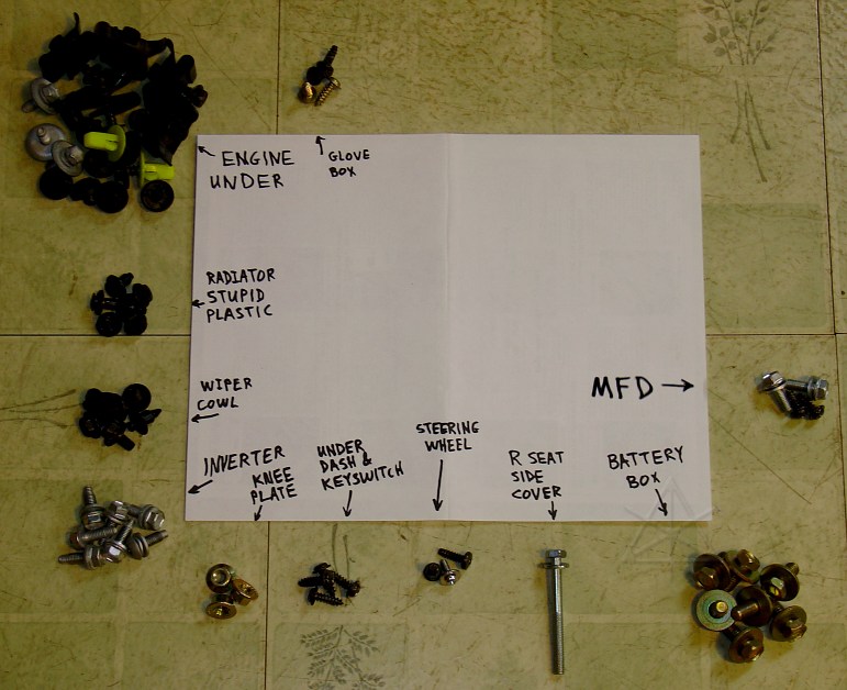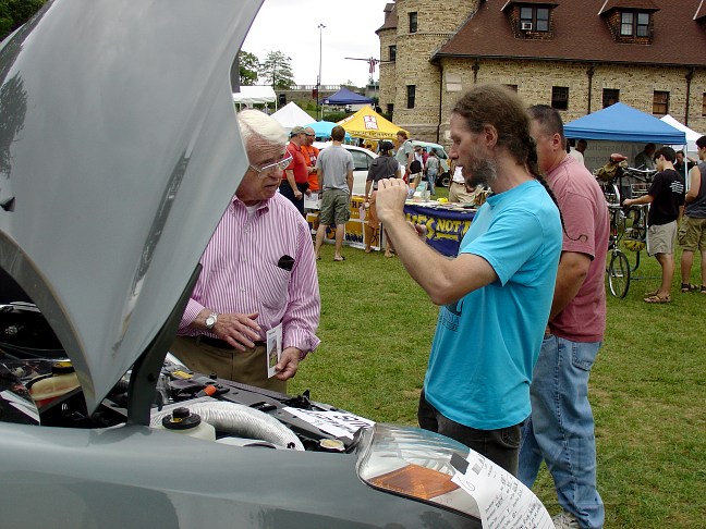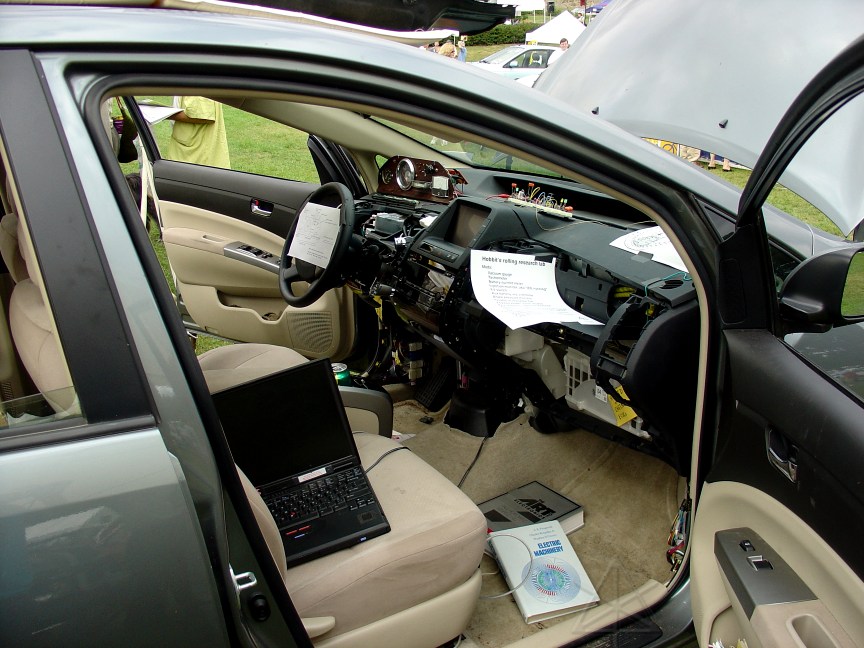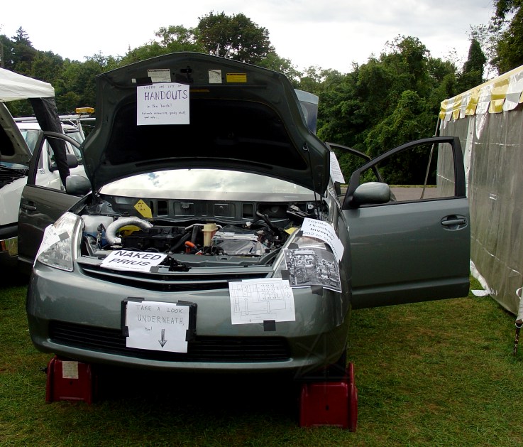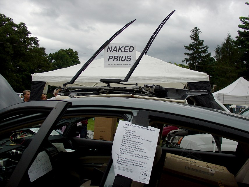 A stock '04 Prius, with many of the covers and panels removed to show all the wires and workings that most people never see, coupled with two days of discussion and making lots of info available. Each image shown here is a link to the fullsize version.