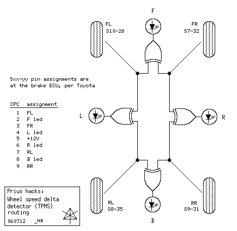Routing This is the overall hookup in the car, using four XOR and driver circuits. Signal and output routing is quite straightforward, and the diamond configuration gives a positionally-sensible and visually immediate look at relative wheel speeds. There are several more interconnect points than just the small CPC, and three layers of wire-color and pin correspondence where things could have gotten crossed up during this particular installation, but once those are connected their specifics aren't important. XOR is one of several methods for detecting relative phase of two waveforms, usually used in phase-lock-loop circuits. Note that the XOR output changes at *twice* the nominal add/cancel beat-frequency between the signals, which must be taken into account when doing any calculations based on timing the brightness changes at the LEDs.