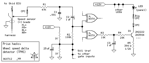 Circuit discussion The un-numbered 1K/1K ladder is common to all four circuits, and derives a 50% reference voltage level between 6 - 7V depending on battery voltage in the car's electrical system. A nominal 13.8V is also fine for powering the CMOS quad-XOR chip. The signal in question is tapped in the usual slit-n-solder fashion, and brought in through a network that does not cause any interference with the sensor or the car's ECUs. The speed sensor at the wheel is a pickup coil with an impedance of about 1.5K, and R1 more than suffices to isolate any possible loading effects away from the normal signal path. C1 applies a little token noise-filtering. The maximum frequency we would ever see here is slightly over 1 KHz, if the car was doing its absolute top speed. One reason this hack works at all is that with 48 teeth around the sensor wheel, the frequencies generally encountered are high enough that determining a delta is a reasonably fast process -- as it indeed must be for ABS itself to be effective. Thus the sensor basically produces an audio signal, and a reasonably healthy one at a volt or two peak-peak. The signal is AC-coupled through C2 into a bias network that floats the XOR gate inputs near half the supply voltage. The coupling cap polarity accounts for the fact that the 1.2V bias of the sensor is below the 50% reference bias. The gate treats the 50% level pretty much as a "maybe" bit, becoming a high-gain and not very linear amplifier in a small region. Because of this, output with the car at rest is INDETERMINATE, and may show LEDs arbitrarily on or off depending on internal gate threshold differences. By about 3 - 4 miles per hour, e.g. creep speed, the sensor signal swings with sufficient amplitude above and below the 50% point to assert a solid 1 or 0, and the XOR gate can then produce output based on phase difference which swings nearly rail-to-rail. This is a completely unorthodox method of CMOS interfacing, but it keeps the parts count much lower. The re-biased signal is split to two gates, where it is XORed with either adjacent wheel. Gate output is low-pass filtered by R3 and C3 for a cutoff beginning at roughly 16 Hz, which corresponds well with where human visual response starts becoming unable to clearly distinguish a flicker rate and perceives a steady level anyway. The resulting voltage is turned into a current through the panel LED by the emitter-follower at Q1, letting the LED's brightness fairly accurately mirror the filtered XOR output. All the driver components are down on the XOR board, leaving only the mounted LEDs and minimal wiring needed up at the gauge panel.